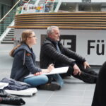 Da interessiert mich natürlich, was die Gruppe dort zeichnet und warum sie hier im Atrium der Stadtwerke ist. Also schnappe ich mir eine Kamera, mein Notizbuch, einen Stift und gehe los. Als die Karla Kolumna der Stadtwerke Erfurt stelle ich mich vor, das zaubert meinem ersten Gesprächspartner sofort ein Lächeln auf die Lippen. Fängt also schon mal gut an. Die ersten Worte wechsle ich mit Professor Klaus Nerlich von der FH Erfurt, der hier mit seinen Architektur-Studenten aus dem 2. Semester eine praktische Übung im Perspektiv-Zeichnen durchführt.