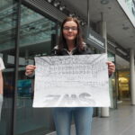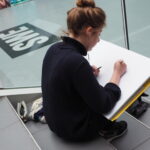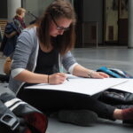 Als ich während des Schreibens zum Nachdenken aus dem Fenster hinausschaue und kurz aufstehe, fällt mein Blick auf eine größere Gruppe junger Menschen. Alle sehr konzentriert, mit großen Blättern vor sich und Bleistiften in der Hand: Sie sind gerade am Zeichnen. Teilweise auf dem Boden oder auf der Treppe sitzend, einige haben kleine Hocker und Klappstühle dabei.