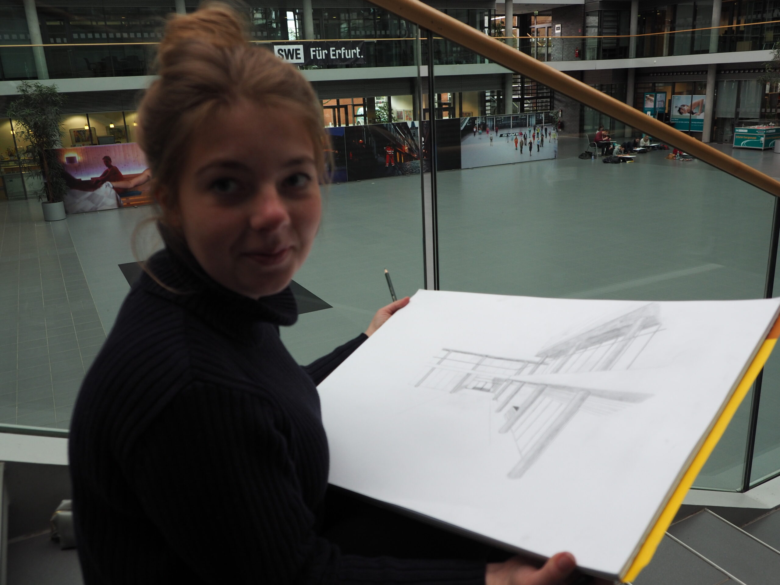 Da interessiert mich natürlich, was die Gruppe dort zeichnet und warum sie hier im Atrium der Stadtwerke ist. Also schnappe ich mir eine Kamera, mein Notizbuch, einen Stift und gehe los. Als die Karla Kolumna der Stadtwerke Erfurt stelle ich mich vor, das zaubert meinem ersten Gesprächspartner sofort ein Lächeln auf die Lippen. Fängt also schon mal gut an. Die ersten Worte wechsle ich mit Professor Klaus Nerlich von der FH Erfurt, der hier mit seinen Architektur-Studenten aus dem 2. Semester eine praktische Übung im Perspektiv-Zeichnen durchführt.