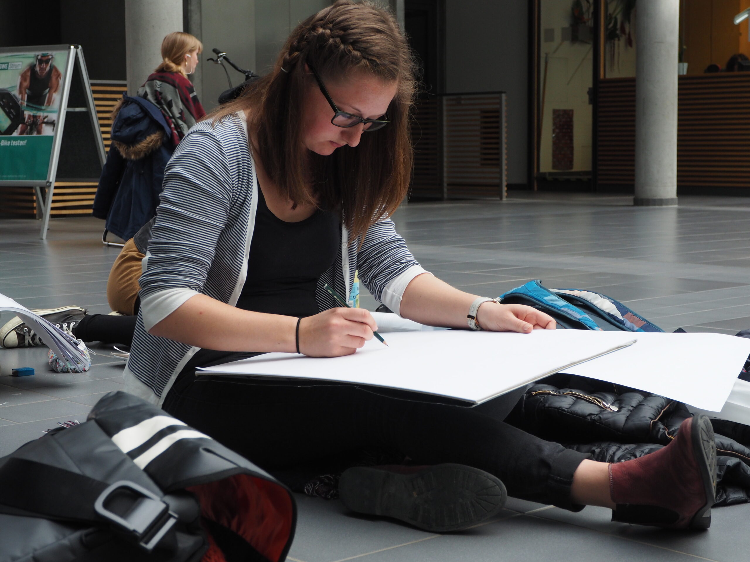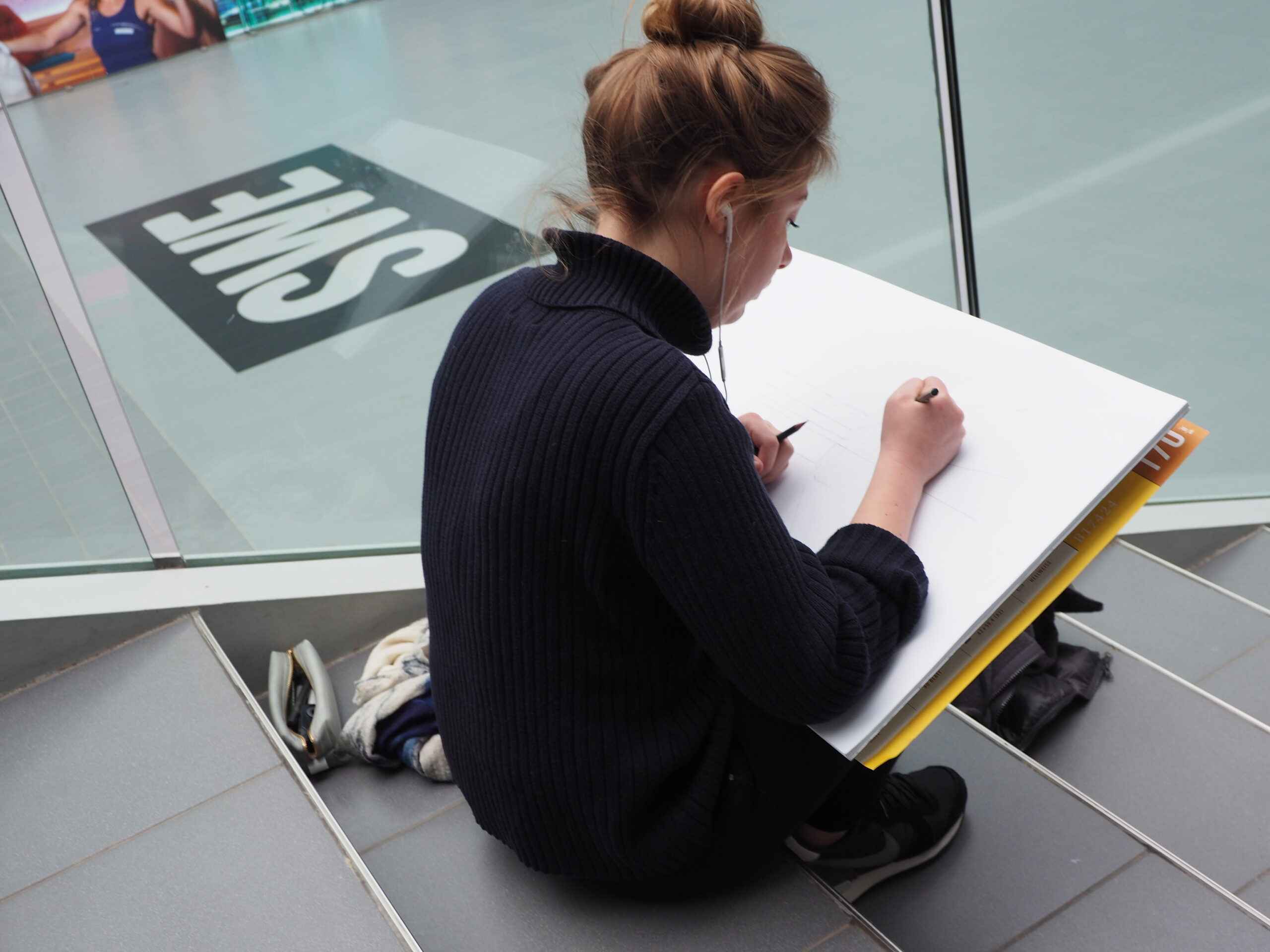 Als ich während des Schreibens zum Nachdenken aus dem Fenster hinausschaue und kurz aufstehe, fällt mein Blick auf eine größere Gruppe junger Menschen. Alle sehr konzentriert, mit großen Blättern vor sich und Bleistiften in der Hand: Sie sind gerade am Zeichnen. Teilweise auf dem Boden oder auf der Treppe sitzend, einige haben kleine Hocker und Klappstühle dabei.