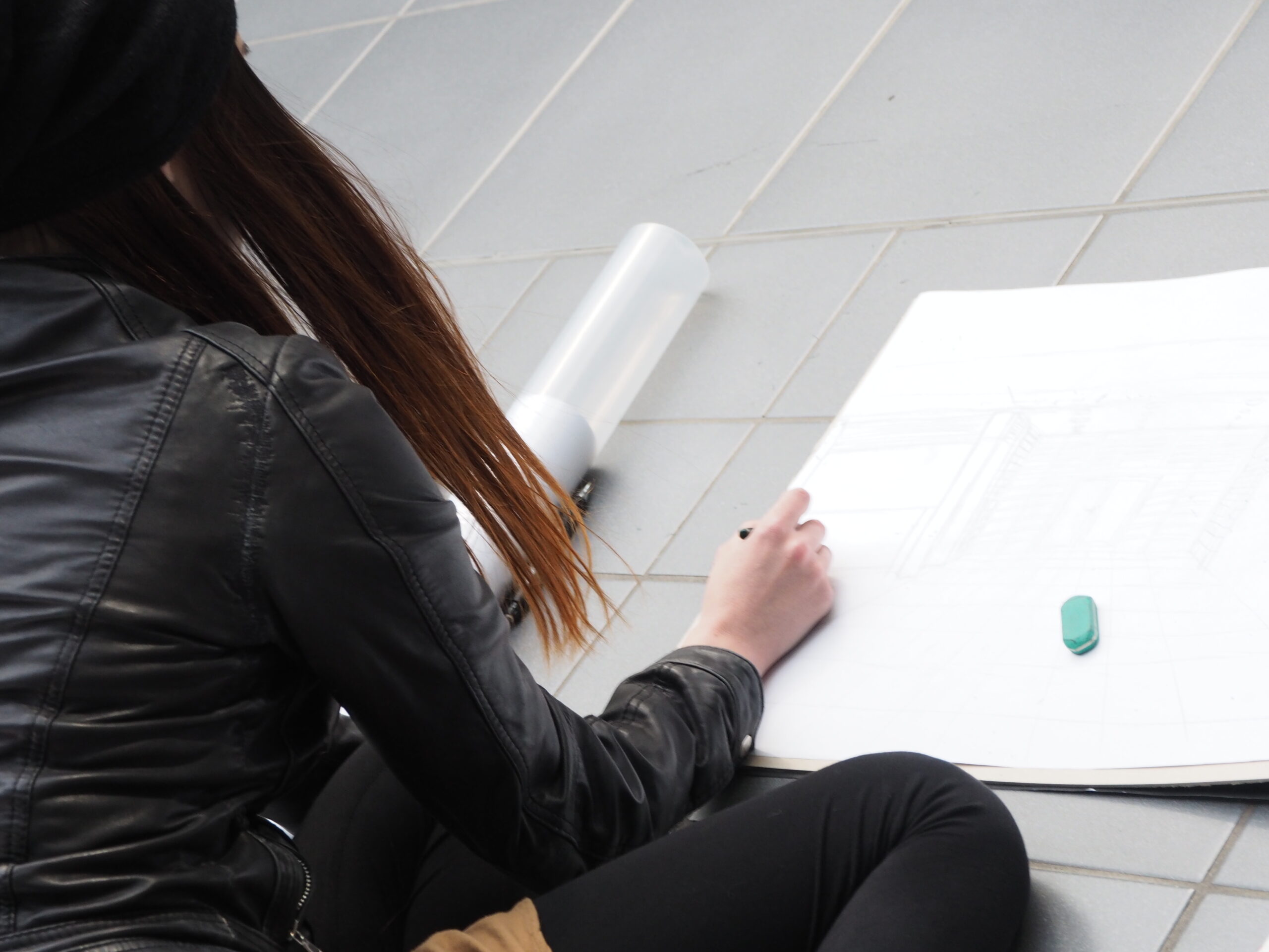 Die Studenten zeichnen frei Hand, was ich persönlich sehr bewundere. Die Zeichnungen zeigen klare und vor allem sehr detaillierte Linien, wohlgemerkt ohne jegliche Hilfsmittel. Weit und breit sind keine Lineale zu sehen. Nur große Blätter, Bleistifte und ab und an ein Radiergummi fallen mir ins Auge. Umso mehr bewundere ich die sauberen und akkuraten Darstellungen. Nach meinem kurzen Plausch mit dem Prof möchte ich natürlich auch gern wissen, was die Studenten selbst von der Aufgabe hier halten.