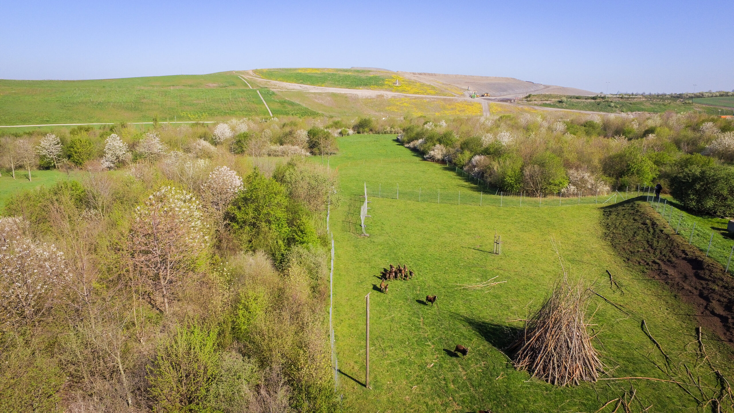 Ganz in der Nähe ertönt ein Krähen. Ein anderes Krähen. Kein gewöhnlicher Hahn. Es raschelt im blühenden Buschwerk, wo summend tausende Bienen die erste Nahrung im Frühjahr sammeln. Da kommt er zum Vorschein: Ein stolzer Fasan auf Brautschau. Bald verschwindet er wieder im Pflanzendickicht. Fünfzig Meter weiter hoppeln Feldhasen einem Berg hoch. Gemächlich trottet eine Herde Schafe über eine Wiese. Rotmilane kreisen am Himmel. Steinhaufen und Totholzhaufen bieten Kriechtieren und Igeln Unterschlupf. So stellt man sich eine Naturidylle vor, aber keine Deponie. „Hier erleben wir täglich ein harmonisches Miteinander zwischen Mensch, Natur und Verwertungsanlagen“, erklärt stolz Geschäftsführer der SWE Stadtwirtschaft, Marco Schmidt. Das Unternehmen betreibt im Auftrag der Stadt die Deponie.