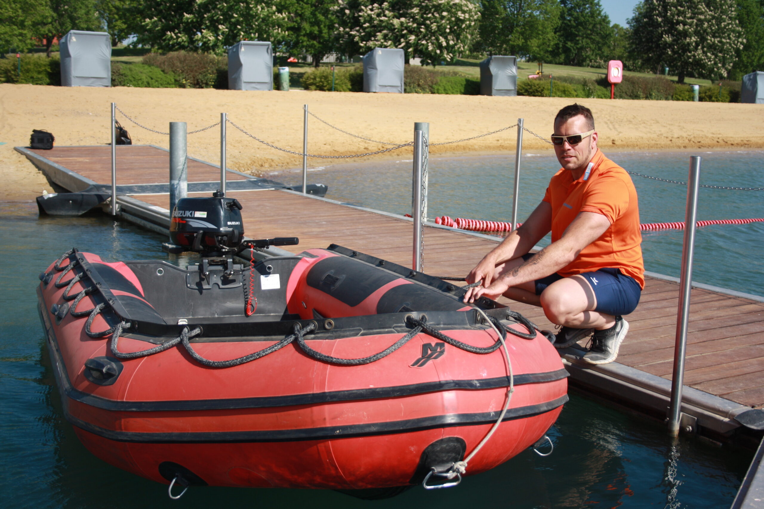 Steffen Kirk, von seinen Kollegen scherzhaft Käpt’n Kirk genannt, überprüft den Luftdruck am knallroten Rettungsboot und wirft schnell noch mal den Motor an. Im Notfall muss es sofort einsatzbereit sein. Danach schiebt er es ans Ufer, in der Hoffnung, dass es nicht zum Einsatz kommt.