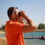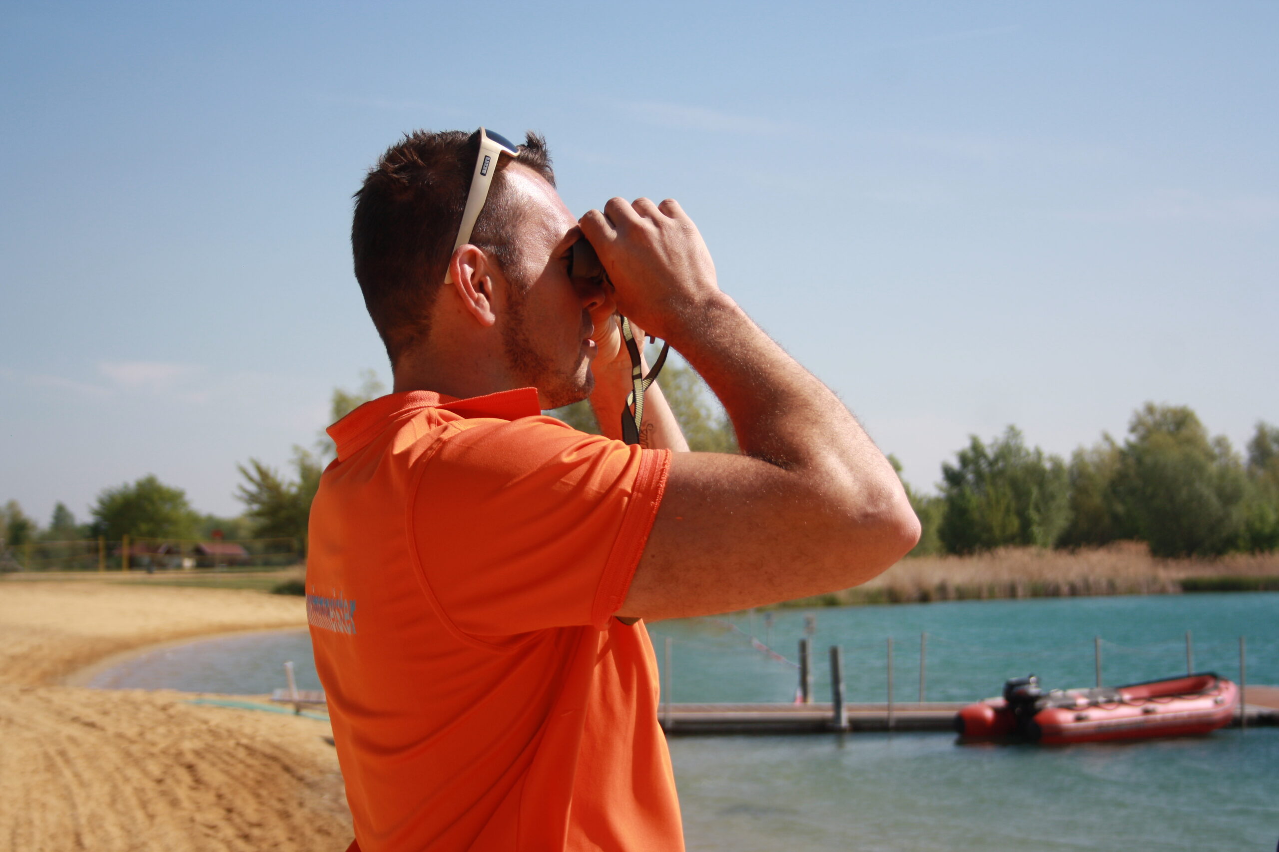 Die Badaufsicht ist ein anstrengender Job. Jede Sekunde ist absolute Aufmerksamkeit gefordert. Wird da hinten im Wasser nur gerangelt oder ist jemand in Not? Vom Turm aus hat Steffen Kirk einen guten Überblick. Dennoch zückt er regelmäßig das Fernglas und behält auch die Schwimmer im Auge, die bis weit über die Bojen hinausschwimmen.