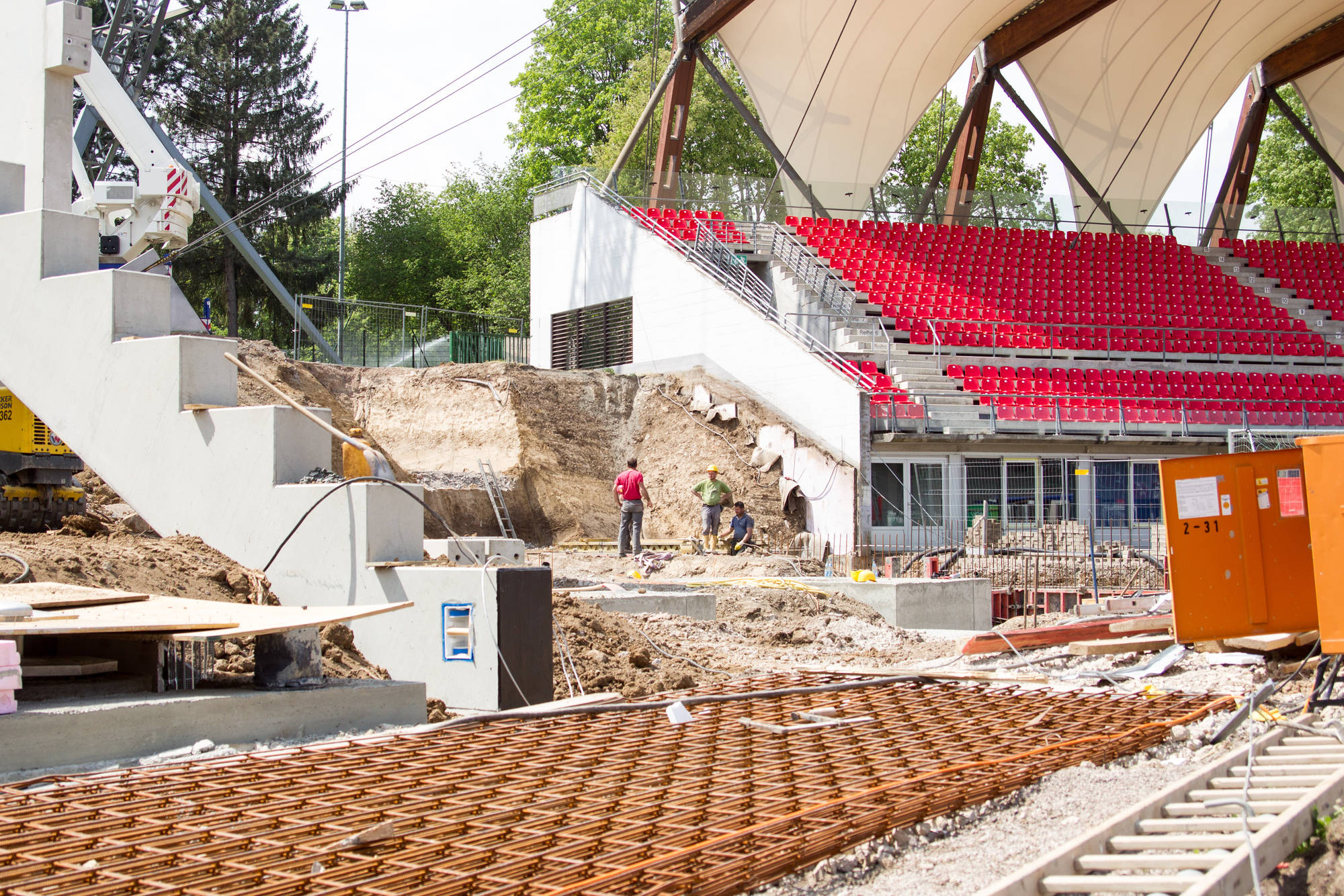 Die Bauarbeiten auf der Arena schreiten voran. Und nicht nur die Südtribüne wächst, auch das Hauptgebäude nimmt weiter Gestalt an und bekommt seine großen Fensterfronten. Aber genug der Worte, wir lassen lieber Fotos sprechen. Aufgenommen hat sie Christian Fischer von der Agentur BILD 13:
