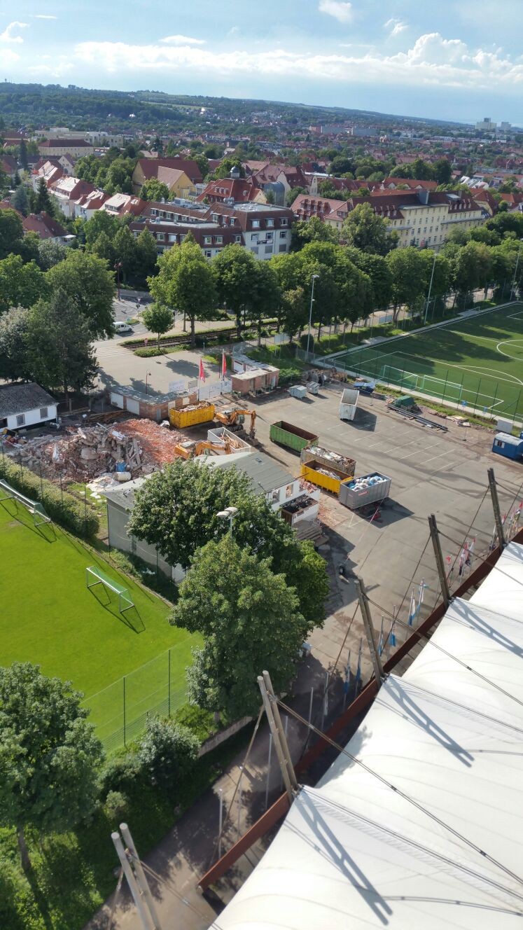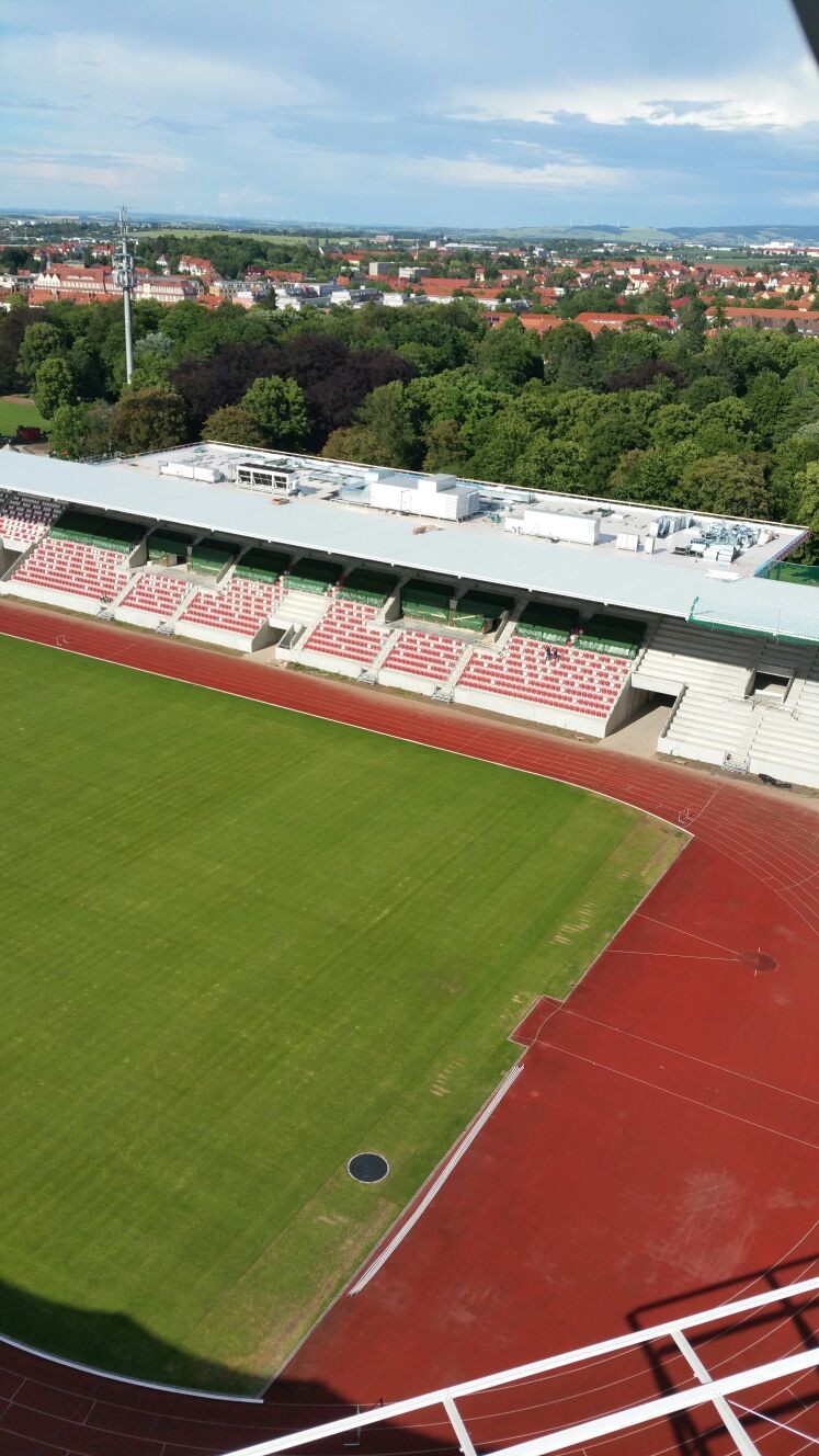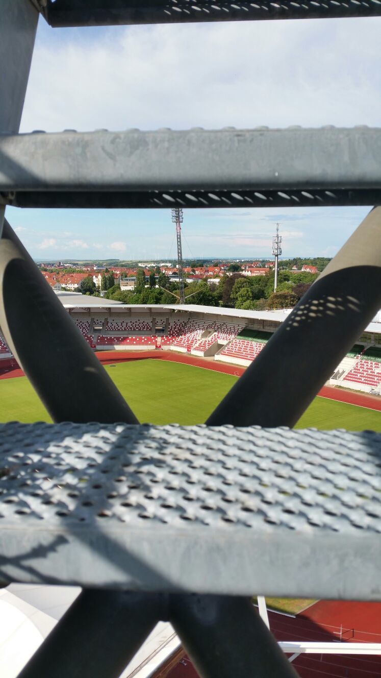 „Auch eine Kamera möchte gewartet werden – vor allem, wenn sie im Himmel über der Arena hängt. Und so mussten jetzt zwei Männer die Flutlichtmasten hoch zur Kamerawartung der Webcam. Jetzt ist wieder alles schön sauber und klare Sicht für aktuelle Bilder im Netz unter www.zeitraffer.com… Mit Durchschnittlich 3560 Klicks pro Tag eine mit großem Abstand am meist besuchten Webcams von Zeitraffer.com. Rang zwei ist übrigens das Pariser Stadion zur EM mit nur 2800 Klicks pro Tag. Vielen Dank für die große Neugier an unserer neuen Erfurter Arena. Bald geht es richtig los und wir vom Arena Technik Team freuen uns schon riesig darauf!“