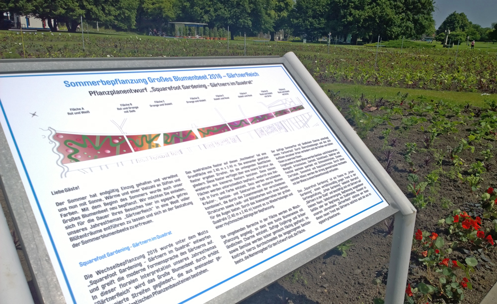 Uwe Schachschal lacht und erklärt: „Das Gartenjahr im egapark steht immer unter einem anderen Thema, 2016 haben wir uns für das „GärtnerReich“ entschieden. Dazu gehören nicht nur Blumen, sondern die gesamte Pflanzenpalette. Wir wollen auch die verschiedenen Formen des Gärtnerns beleuchten, auf dem Großen Blumenbeet ist das Square Foot Gardening. Der Nutzgarten im Quadrat oder Gärtnern im Quadrat ist die wohl einfachste Methode, einen Gemüsegarten neu anzulegen oder einen bestehenden in einzelne quadratische Beete umzugestalten. Diese lassen sich viel leichter bearbeiten, weil sie übersichtlicher sind. Bei geschickter Pflanzenwahl kann man fortlaufend ernten.“