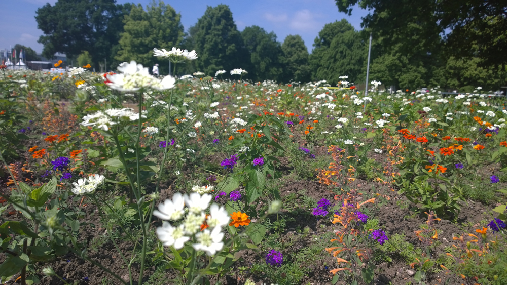 Besonders ist auch der Farbverlauf der Gesamtanlage, die vom Festplatz bis zu den Pflanzenschauhäusern reicht: Rot und Weiß beginnt es an Halle 1, wechselt in Rot und Orange mit Gelb, weiter geht es mit zwei Abschnitten in Orange und Violett, dann folgen zwei Bereiche in Violett und Rose und den Abschluss bilden zwei Beetareale in Rose und Violett mit Grün. Dreimal wöchentlich wird gegossen, die Beregnung schaltet sich automatisch ein und aus.