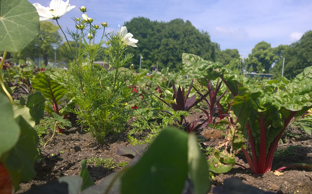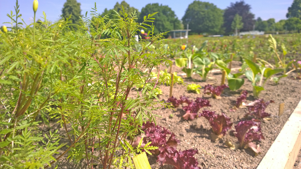 Uwe Schachschal ist gespannt, wie die neue Formensprache des Großen Blumenbeetes bei den Besuchern ankommt: Gemüse gemixt mit essbaren Blüten und eine blühende Wiese statt formal bepflanzter Blumenbeete. Ausgedacht hat sich die Sommergestaltung des 6000 m² großen Areals die in Niedersachsen ansässige Landschaftsarchitektin Petra Pelz, deren Handschrift bereits verschiedene Beete und Themengärten im egapark tragen. Seit den 1990er Jahren gestaltet sie Privat- und Firmengärten, seit fünfzehn Jahren auch Anlagen für Gartenschauen. So war sie mit ihren Pflanzideen zum Beispiel bei der Internationalen Gartenschau Hamburg 2013 vertreten. Der Gemüse-Blumen-Mix hat ein wenig vom Stil alter Bauerngärten, dort wuchsen zwischen den Blumen Rhabarber oder Liebstöckel, passten sich Schnittlauch oder andere Kräuter in die Gestaltung ein.