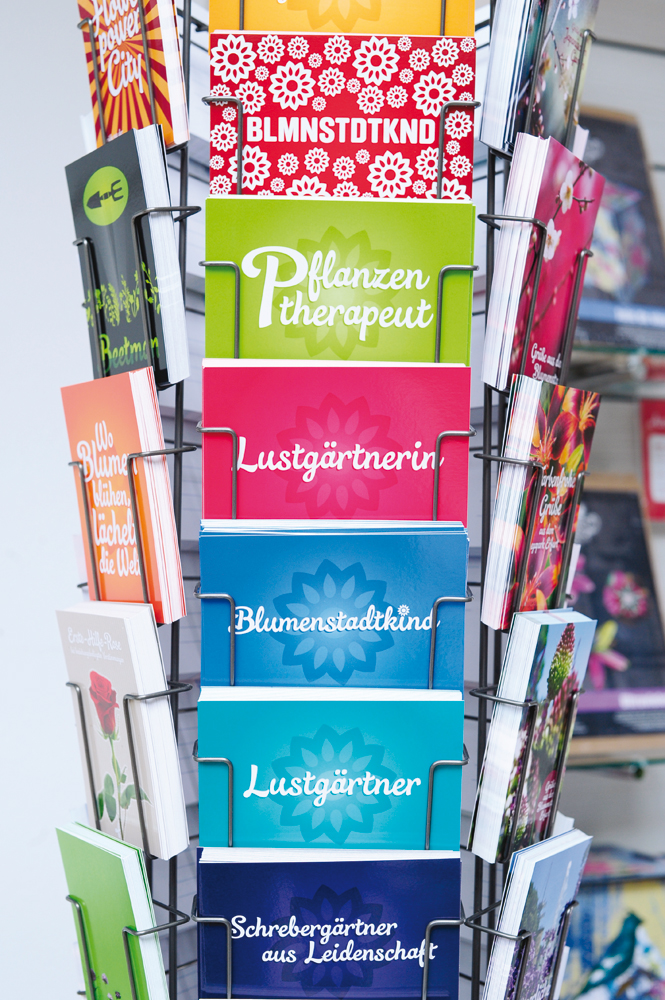 „Auf der Karte fehlt ein U!“ – Über den Hinweis eines aufmerksamen Besuchers im neuen egapark-Shop muss Hardy Karius schmunzeln. Der 40-Jährige Erfurter ist einer der Geschäftsführer der Erfurter Kreativagentur covermade und hat die Karte entwickelt. ‚BLMNSTDTKND‘ ist aufgedruckt, das A, das I und das E gibt es auch nicht. In der Kürze liegt die Würze – hätte man früher gesagt. Heute sind Wörter ohne Vokale ein Trend der Werbung. Der Sinn: Aus einem allgemein üblichen Begriff entsteht so ein schützenswerter Name – Markenrecht eben.