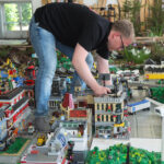 An einem Samstag besuche ich die beiden Bauherren in Halle 1. Dort wuselt es rund um die Miniaturstadt. Neben Hoffmann und Wirtz sind viele große und kleine Schaulustige vor Ort. An einem schwarzen T-Shirt mit rotem Lego-Stein darauf erkenne ich die „Brick Fans Thüringen“. Das sind erwachsene Lego Fans (ELFs), die sich regelmäßig in Erfurt zum Stammtisch oder bei gemeinsamen Veranstaltungen treffen. Ihre Altersspanne reicht von 22 bis 63 Jahren – eine Altersgrenze gibt es nicht.