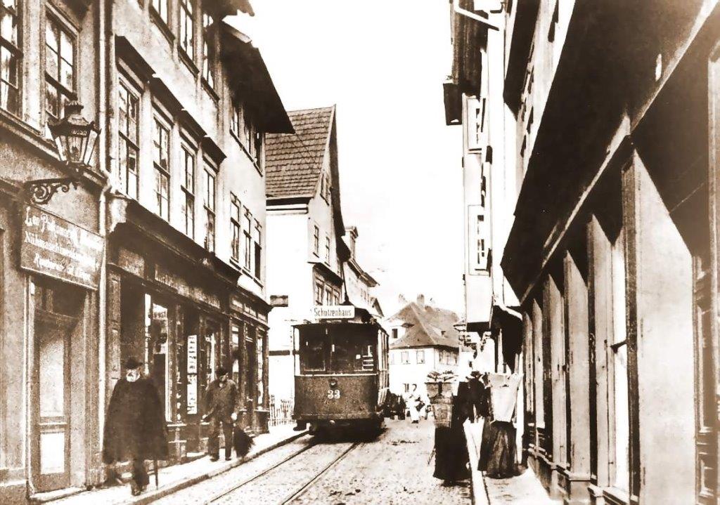 Unser heutiges Bild zeigt den Triebwagen 33, Baujahr 1899, um 1900 auf der Langen Brücke. Erstmals zweimotorig waren die 12 Triebwagen dieses Bauloses von der Waggonfabrik Lindner in Halle-Ammendorf vor allem für den Beiwagenbetrieb gedacht, denn die bisher einmotorigen Wagen hatten mit den angehängten ehemaligen Pferdebahnwagen vor allem auf den Steigungsstrecken im Süden der Stadt ihre liebe Not.