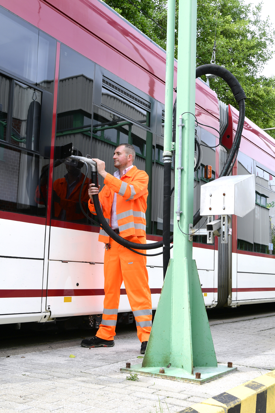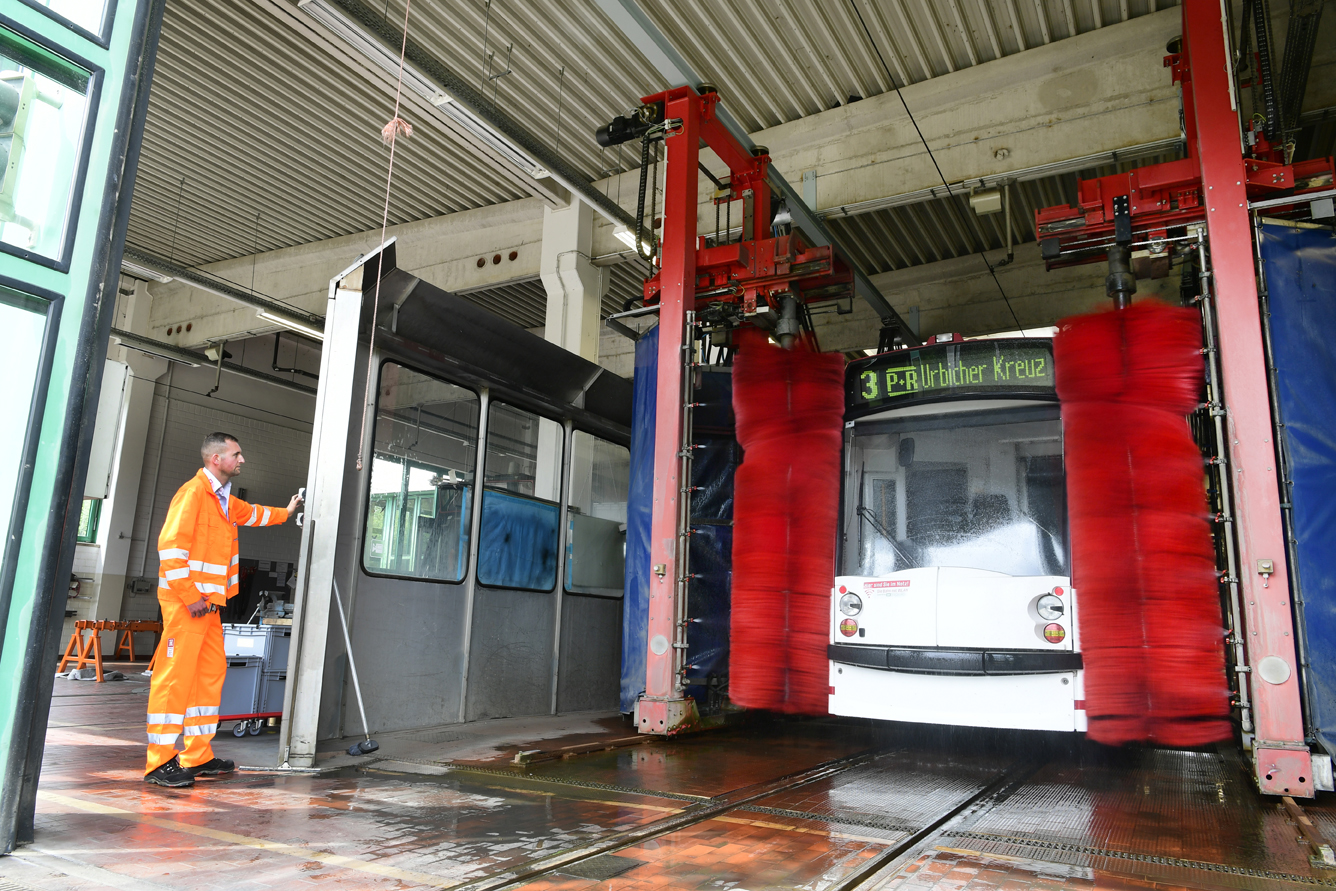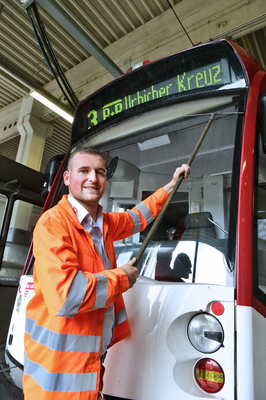 „Manchmal holen wir auch Schadfahrzeuge rein. Dann steigt der Fahrer auf eine andere Bahn um, damit der Linienverkehr wieder rollen kann“, sagt er. Der letzte Einrücker kommt in der Woche um 1.27 Uhr. „Auch dann ziehen wir sie durch die Waschanlage und machen sie fit für den nächsten Tag, wechseln auch schon mal Lampen aus. Wir koppeln die Wagen um, machen große aus kleinen Zügen, die werden vor allem morgens gebraucht, im Berufsverkehr“, erzählt der 30-Jährige, der im Zwei-Schicht-System arbeitet, in der Woche und auch am Wochenende. Im Schnitt sind 44 Züge pro Tag im Einsatz, darunter normale Wagen mit 30 Metern, aber auch Doppelzüge. Die ersten rücken am nächsten Tag schon wieder um 4.01 Uhr wieder aus. „Dann müssen sie bereit sein“, sagt er. Dafür sind er und seine Kollegen dann schon wieder ab 3 Uhr morgens im Einsatz.