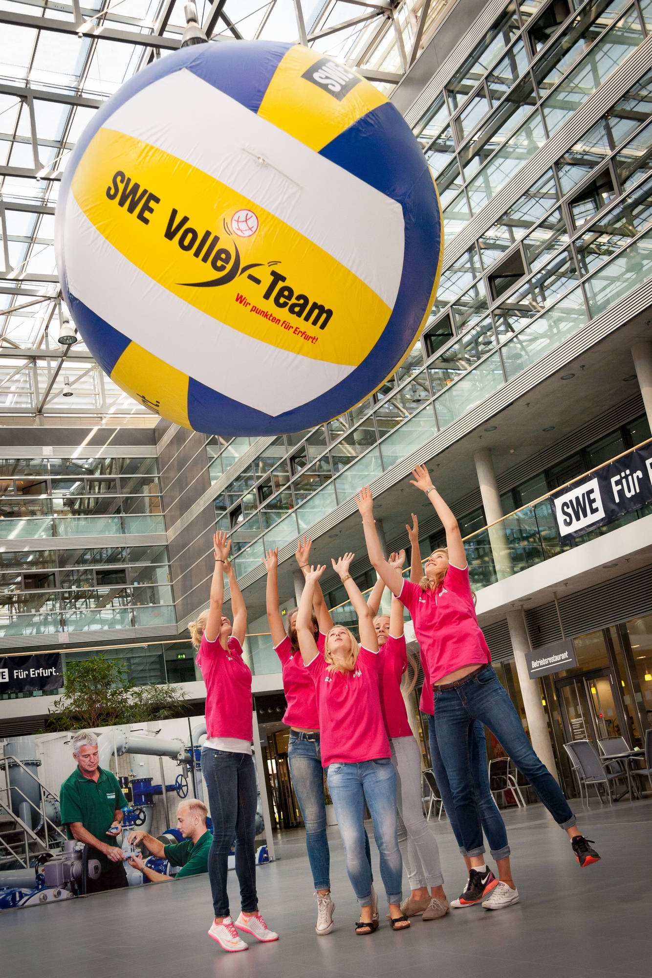 Die gibt es bereits zur Teampräsentation. Mit einem riesigen Volleyball werden Fotos für die Medien und den Sponsor gemacht. Immer am Ball sozusagen, das Team und die Sponsoren und Spaß dabei.