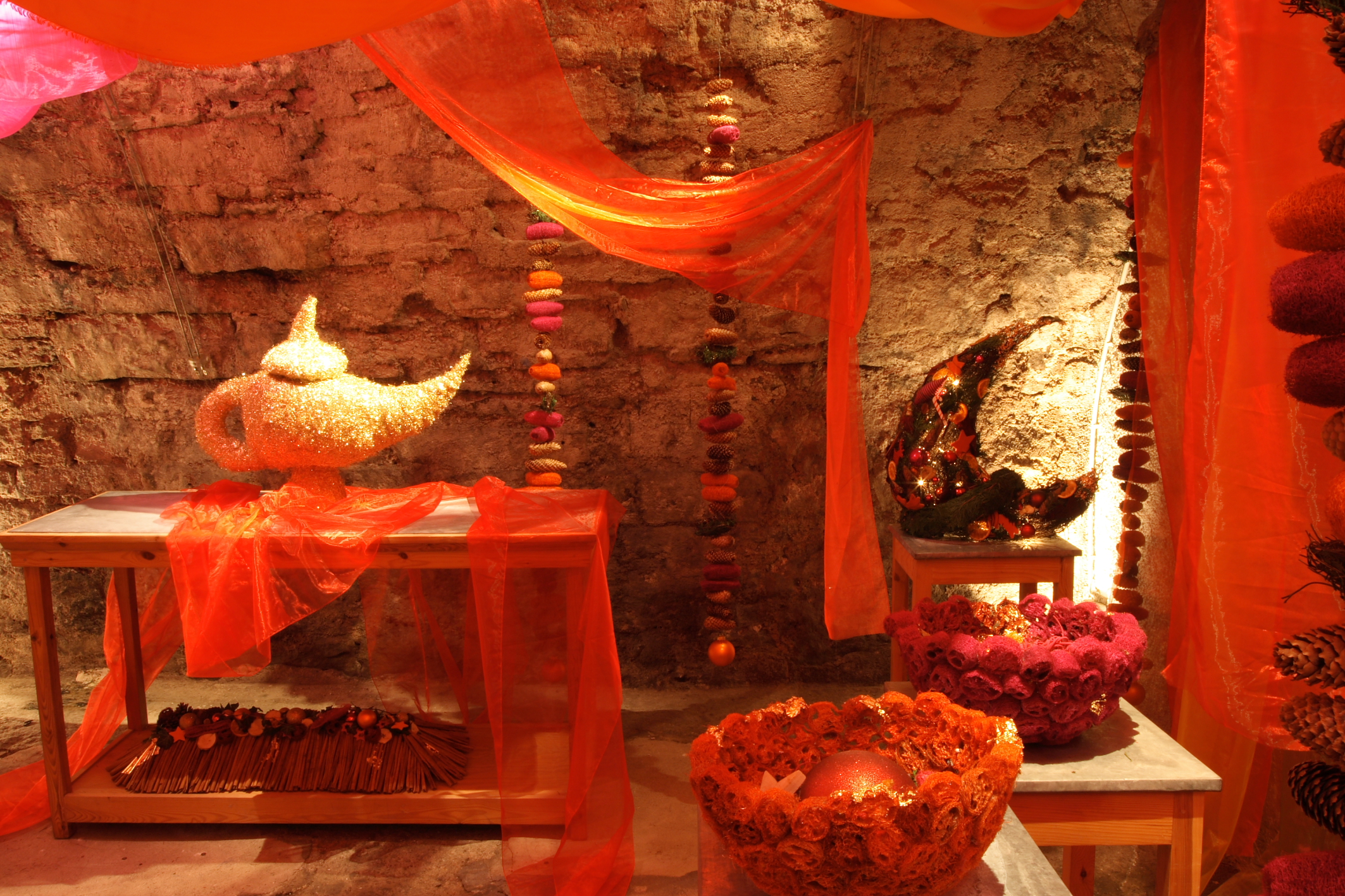 Die Räume sind traumhaft, mit den Nischen geradezu perfekt für eine weihnachtliche Schau. Doch zu diesem Zeitpunkt war der Felsenkeller ungenutzt, feucht und wenig anheimelnd. Viel Kraft und Zeit haben die Kollegen der ega in den Felsenkeller investiert, Licht verlegt. Die Handwerker haben Podeste gezimmert, denn der Boden in den Nischen war ziemlich uneben, die Steine waren bucklig. Und auch die Gänge waren aufgrund der Feuchtigkeit oft glitschig. „Anfangs haben wir viel mit Stoffen abgehangen, um eine angenehme Atmosphäre zu schaffen. Denn überall bröckelte es, man konnte keinen Nagel in die Wand schlagen, schon rieselte es von oben“, erzählt Cornelia Squara.
