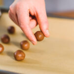 Nochmals ca. 1 Stunde kalt stellen. Die Hälfte der Kugeln aus dem Kühlschrank nehmen, auf ein mit Backpapier ausgelegtes Blech setzen. In die Vertiefungen mit einem Teelöffel etwas Gelee verteilen. Restliche Kugeln kurz vor dem Backen auf das Backblech setzen und füllen. Bleche nacheinander im vorgeheizten Backofen E-Herd: 200 °C bei stiller Hitze 10–12 Minuten backen.
