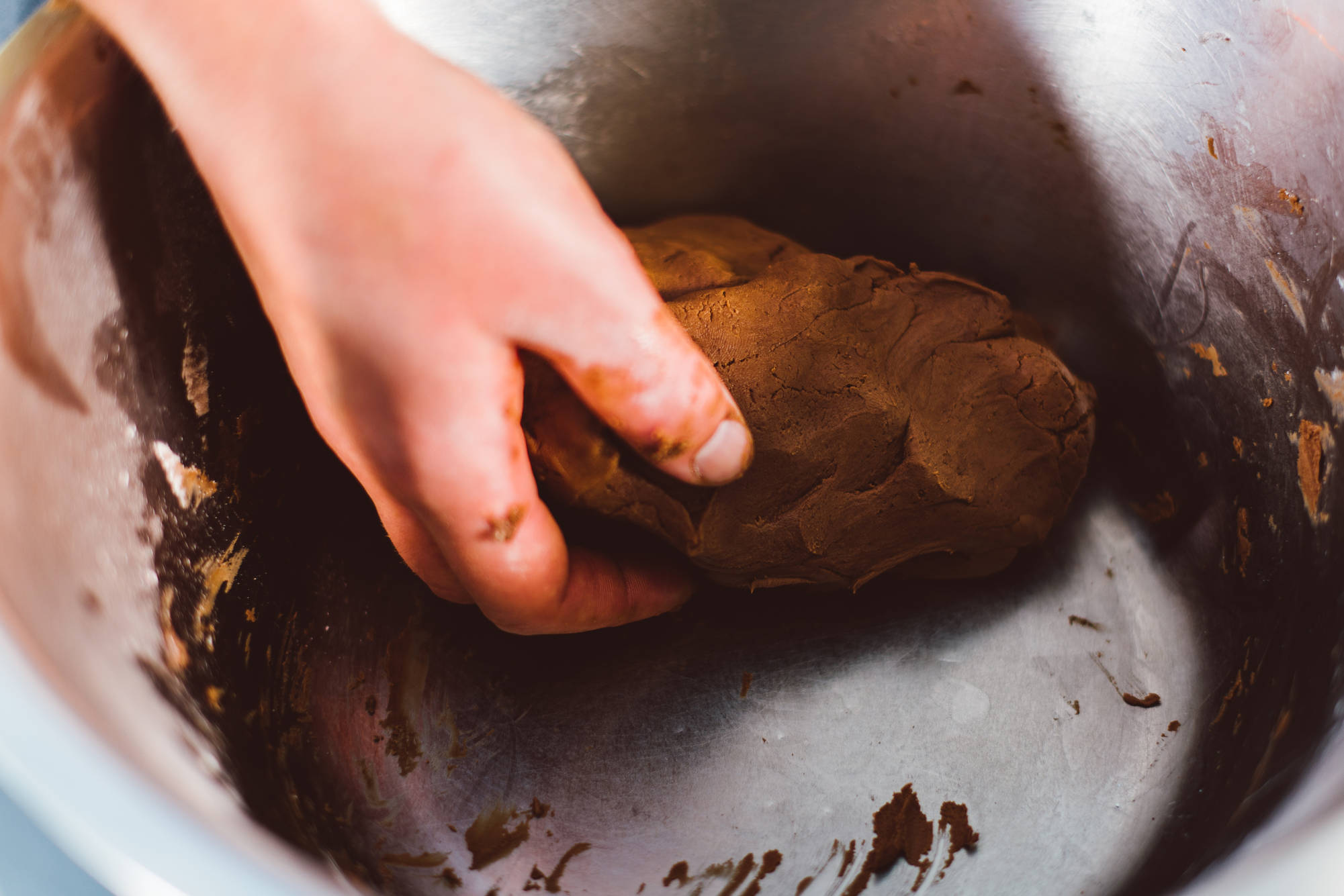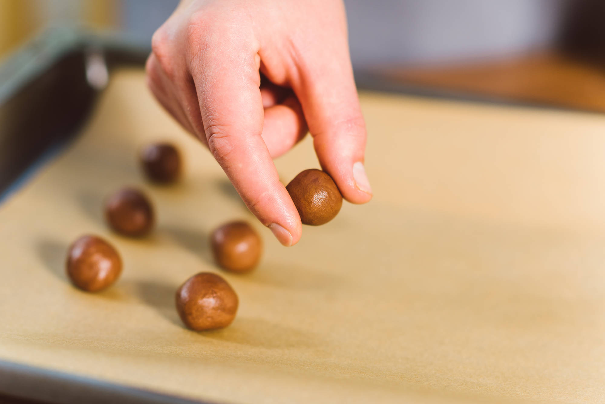 Mehl und Backpulver in eine Schüssel sieben. Zucker, Salz, Vanille-Zucker, Eigelbe und Butter in Flöckchen hinzufügen. Anschließend auf der Arbeitsfläche mit den Händen zu einem geschmeidigen Teig verkneten. Daraus sechs Rollen formen, in Folie wickeln und ca. 30 Minuten in den Kühlschrank stellen. Anschließend jede Rolle in ca. 12 Scheiben schneiden, diese zu Kugeln formen. Dicht an dicht auf Bretter setzen und mit einem Holzstiel in die Mitte eine Vertiefung drücken.