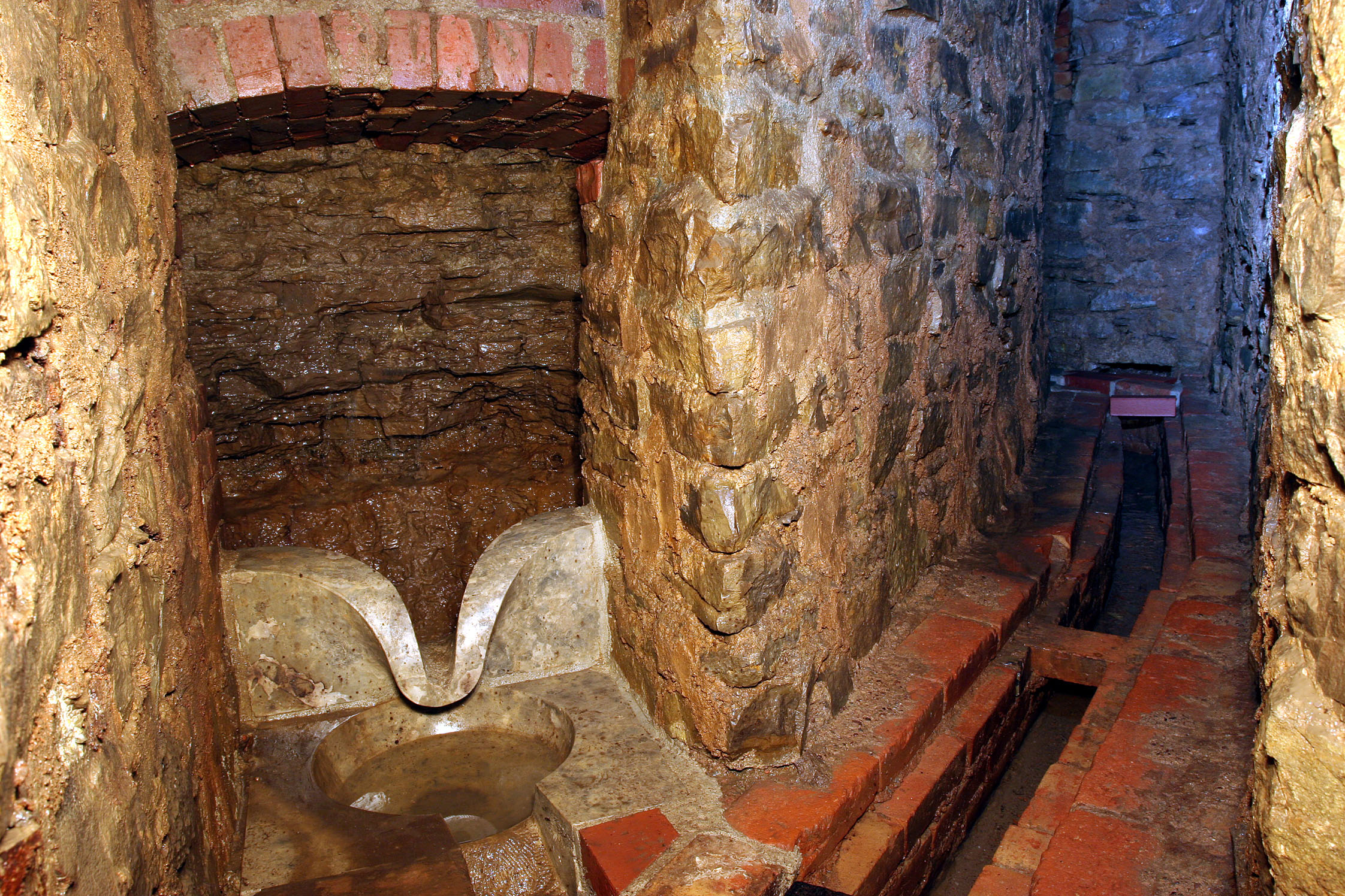 Wir schreiben das Jahr 1136. Dem Mönch ist durch praktische Erfahrungen das Prinzip der kommunizierenden Röhren bekannt.Wissenschaftlich beschrieben wird es erst 1647. Der Franzose Blaise Pascal erkennt 500 Jahre später anhand praktischer Experimente eine physikalische Gesetzmäßigkeit: Eine homogene Flüssigkeit steht in offenen Röhren oder verbundenen Gefäßen gleich hoch, weil die Schwerkraft und der Luftdruck konstant sind. Dies war die technische Voraussetzung für die erste Wasserleitung, die 1136 unter Abt Wernher I. entstand und das kostbare Nass von der Quellfassung in Peterborn zum Benediktinerkloster auf dem Erfurter Petersberg lieferte. Was das Gesetz der kommunizierenden Röhren mit einer Wasserversorgungsanlage zu tun hat? Sehr viel, denn Anfangs- und Endpunkt lagen auf einer Anhöhe. Zwischen beiden Punkten hatte die Leitung deutlich tiefer gelegene Stellen zu durchqueren. Die musste das Wasser ohne die Hilfe von Pumpkraft überwinden. Die Leitung war solide aus Blei gebaut und überwand 30 m Höhenunterschied zwischen ihrem Anfangs- und Endpunkt. Das Wasser wurde faktisch den Petersberg hinauf geleitet.