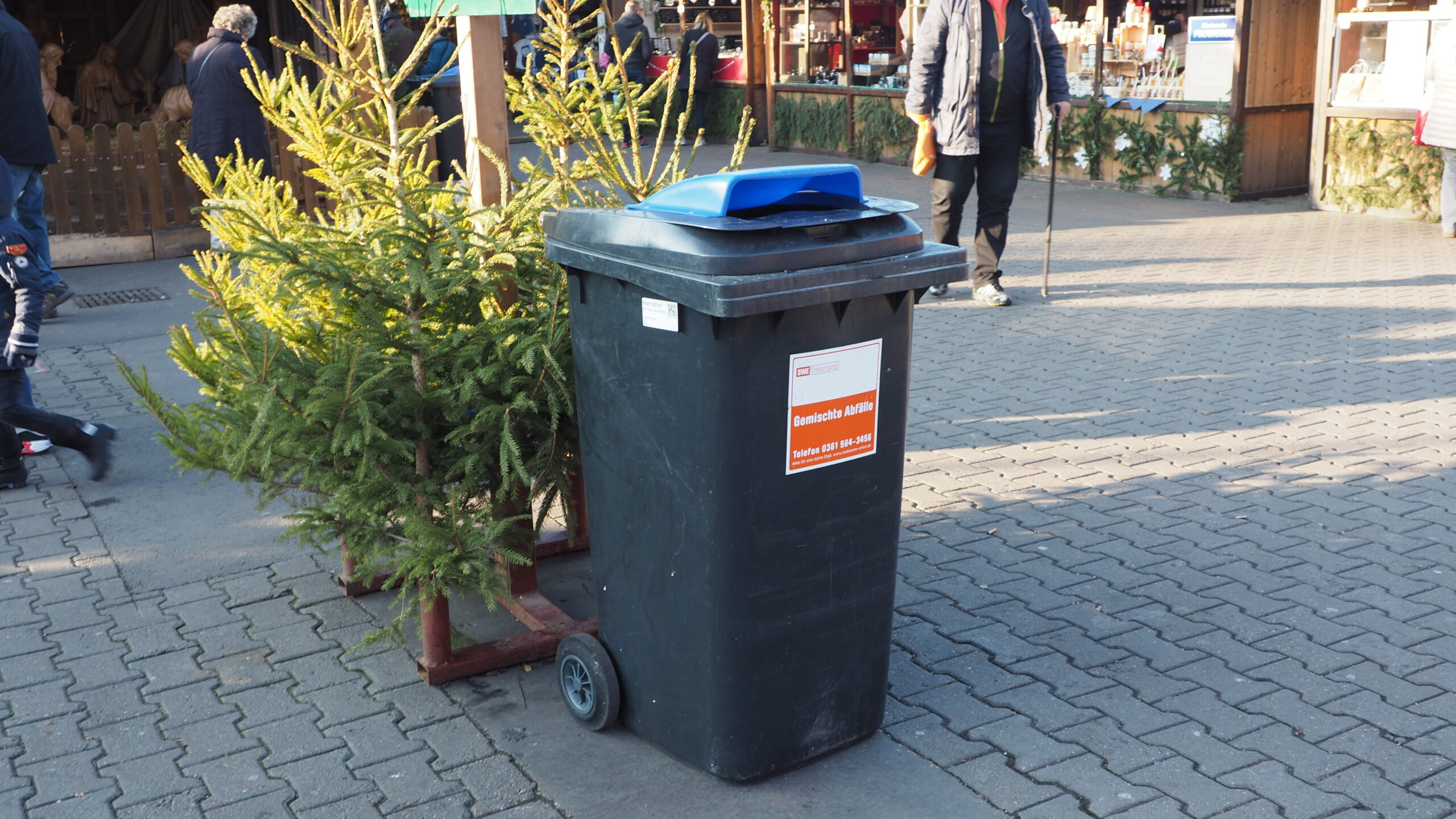 Durchschnittlich kommen zum Weihnachtsmarkt ca. 46 Tonnen Marktabfälle, 1,7 Tonnen Kunststoffabfälle (Glühweinbehälter) und 11 Tonnen Kartonagen zusammen.