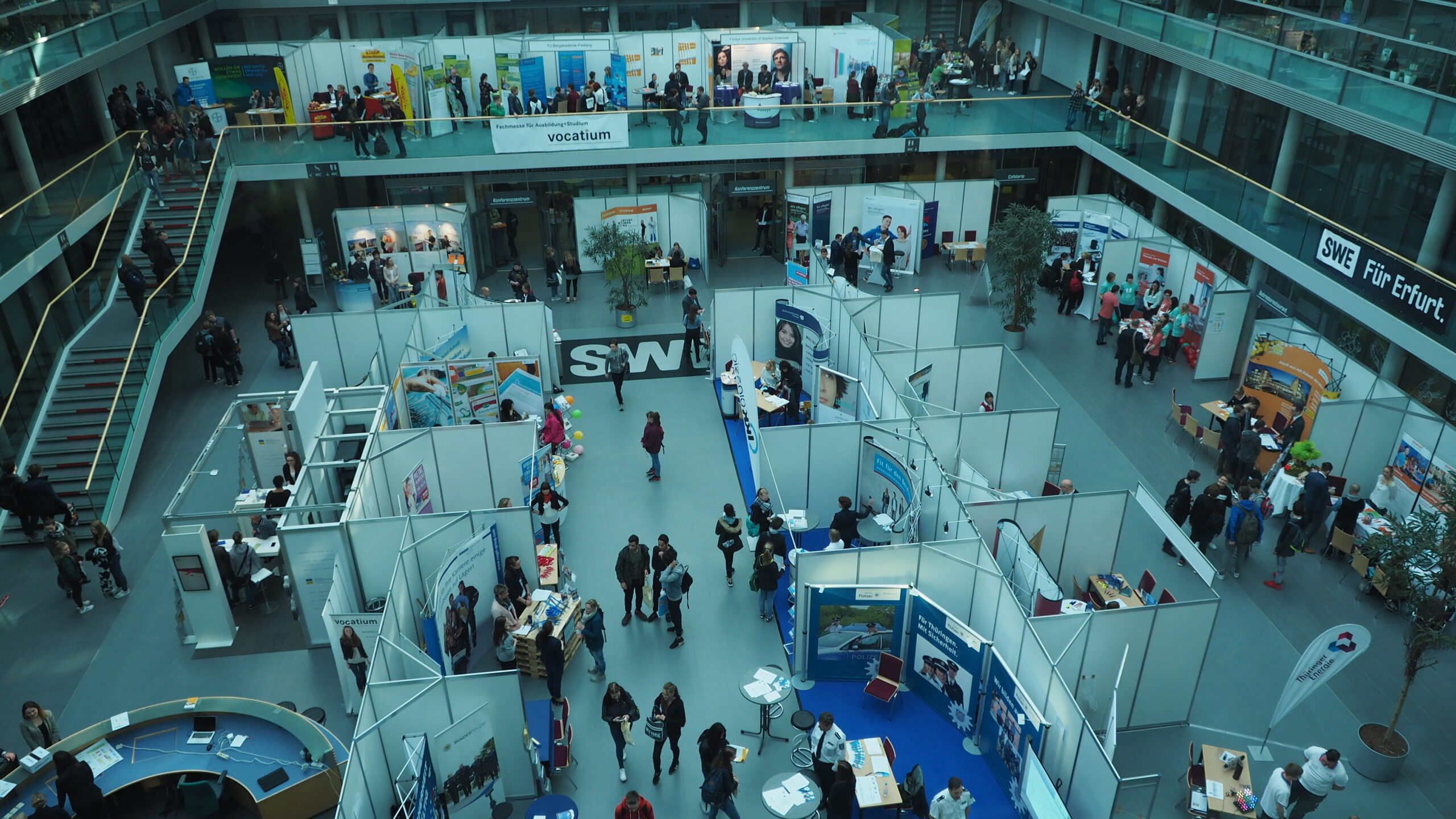 Im Atrium des SWE Hauptsitzes in der Magdeburger Allee ist seit heute Morgen richtig Betrieb – 55 verschiedene Stände sind auf zwei Etagen vor dem Kundenzentrum aufgebaut. Um 8.30 ging es dann los, egal ob Einzelbesucher oder Schulklasse: Es ist wieder ‚vocatium‘!