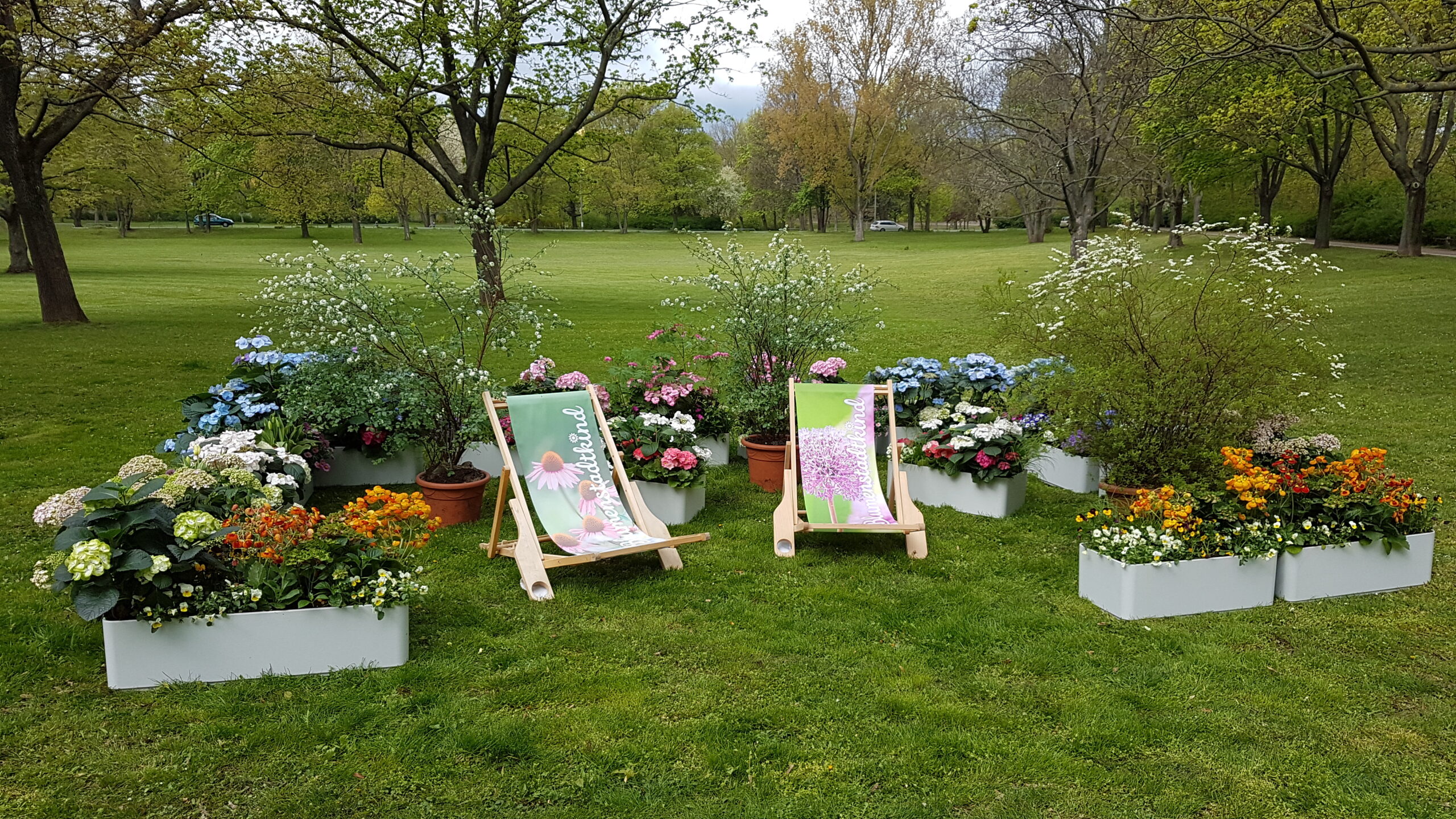 Die Pritsche des Transporters hat genau die richtige Größe – alle 16 Bausteine passen alle rein. Ab geht es! Kurz vor 10 stehen wir im Nordpark. Jogger und Hundebesitzer sind unterwegs. Es quietscht – unser Zeichen! Die Uhr läuft! Zehn Minuten später steht eine nette Blumenoase am Wegesrand. Gelb, rot, blau – alles dabei, und zwischendrin flattern BUGA-Fähnchen. Erste Leute bleiben stehen und staunen. Mutige setzen sich auf die Liegestühle, die zwischen den Blumen stehen. „Und was soll das?“, fragt ein älterer Herr. Wir klären ihn auf. Heute ist der 23. April, der Tag, an dem in vier Jahren in unserer Stadt die Bundesgartenschau startet. Auch hier im Nordpark. Der Mann findet’s toll und schwärmt von der Strecke, die von hier aus weiter in den Norden führt – nach Gispersleben. Dort ist schon viel zu sehen von dem, was die BUGA bringt. Er zählt auf: Die Flussschleife, der neue Park, der da entsteht, all die Pflanzen… Es quietscht! Das Zeichen! Wir müssen weiter.