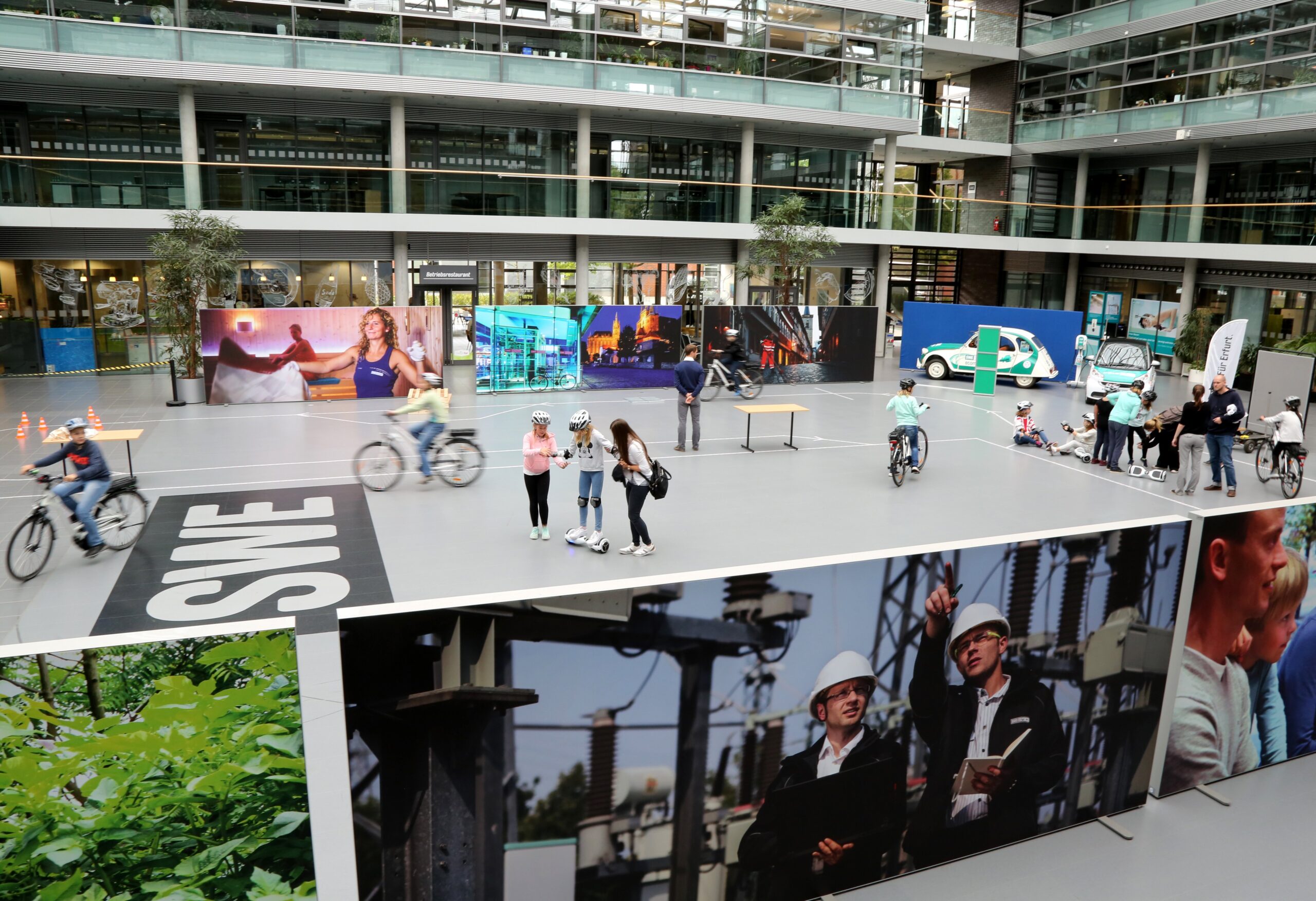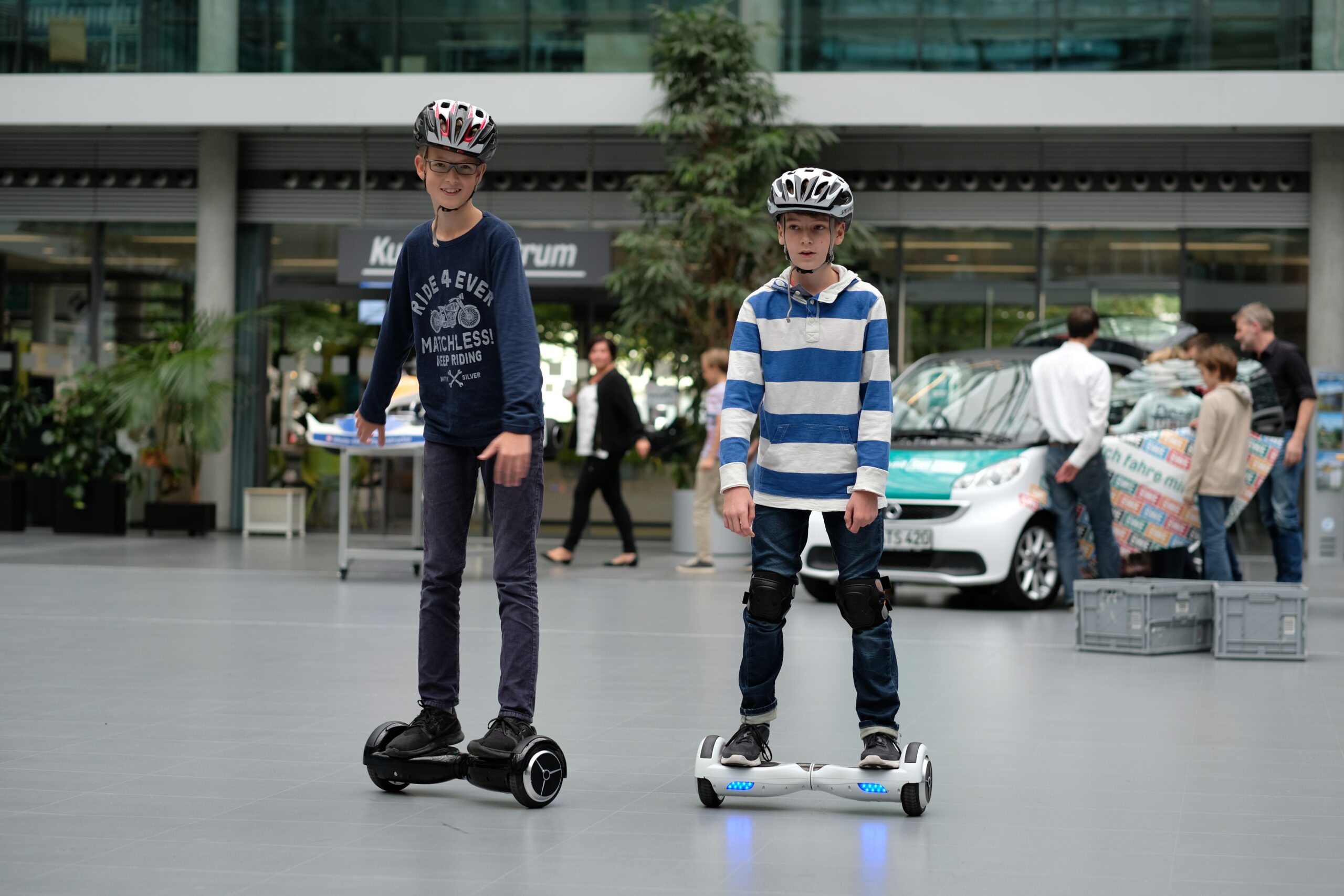 Ich sitze im dritten Stock der Stadtwerke Erfurt am Schreibtisch und höre plötzlich fröhliches Getümmel und elektronisches Surren. Als ich aus dem Fenster in das Atrium schaue, sehe ich Kinder auf elektronischen Skateboards und Fahrrädern herumflitzen. Außerdem stehen dort noch ein elektrisch betriebener Smart und eine E-Ente. Ein Junge fährt ganz locker mit einem Hoverboard durch einen Parcours. Er heißt Jan und geht in die 7b des Heinrich-Mann-Gymnasiums. Dass der 12-Jährige Probleme beim Start mit dem Hoverboard hatte, glaubt man nicht, wenn man ihn durch die Halle düsen sieht. Er manövriert sich geschickt an einem Hindernis vorbei, schnappt einen Beutel und lädt ihn beim nächsten Tisch wieder ab.
