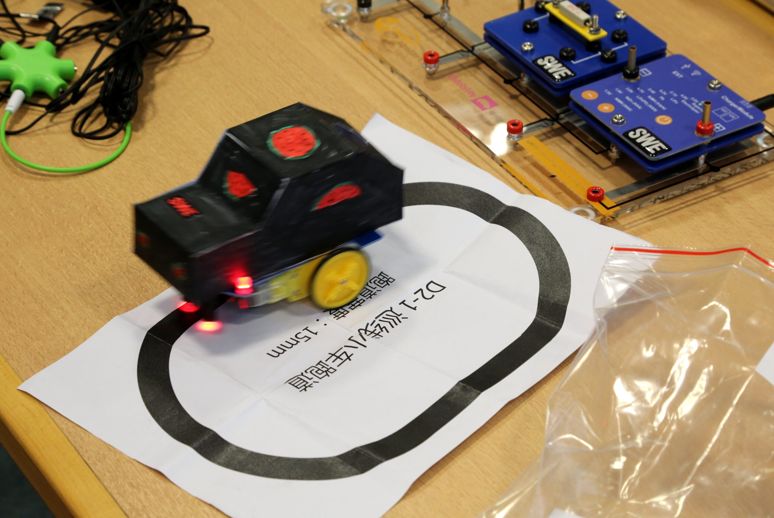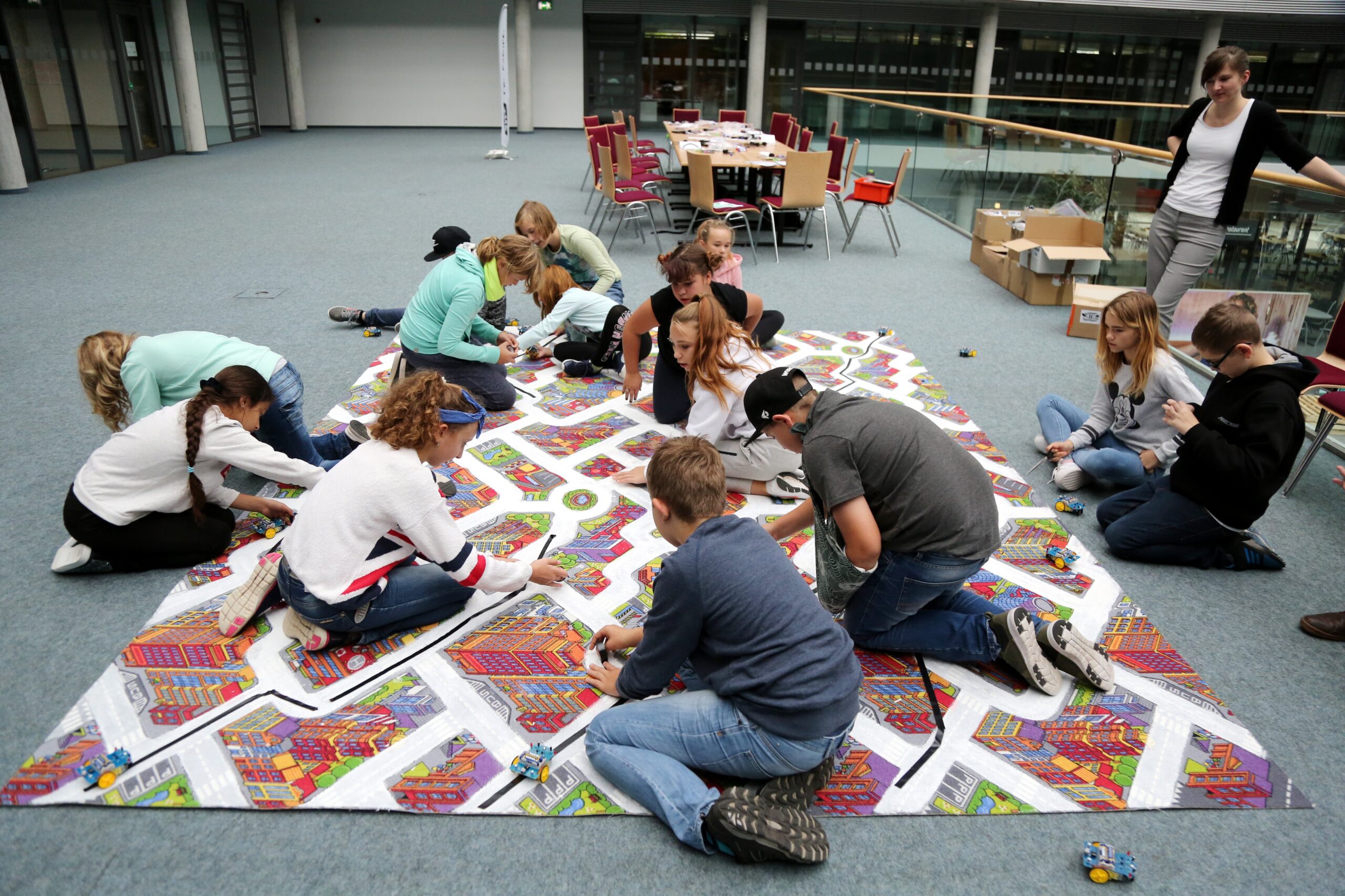 Auf der Galerie des Atriums ist gerade Klasse 7a mit kleinen batteriebetriebenen Autos auf einem großen Verkehrsteppich zugange. Lena und Nike haben einige der Wege auf dem Teppich mit schwarzem Klebeband beklebt. Lena erklärt mir: „Das Auto erkennt die schwarze Striche und fährt ihnen nach, es hat Sensoren.“ Direkt daneben stellen ihre Klassenkameraden weitere autonom fahrende Autos zusammen. Andere sind ganz in das Basteln eines Papieraufsatzes vertieft, der das Fahrzeug wie ein tatsächliches Auto aussehen lassen soll.