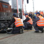Wieder einmal bewiesen die Kollegen der EVAG, dass sie ein eingespieltes Team sind. Mit Luftkissen hoben sie die Bahn an, entfernten simulierte Unfallteile (in diesem Falle ein alter Gartenstuhl) und brachten das Rangiergerät zum Einsatz. Wichtig dabei: Die Bahn muss immer im Lot sein, also gerade stehen. Unter der Regie von Mario Linßer, Meister Hauptwerkstatt 1, der schon beim Ziehen der Black-Dragons-Bahn durch Fans der Dragons den Hut aufhatte, zeigten Team Rot und Team Gelb, wie sie die Bahn innerhalb kürzester Zeit wieder ins Gleisbett bringen.