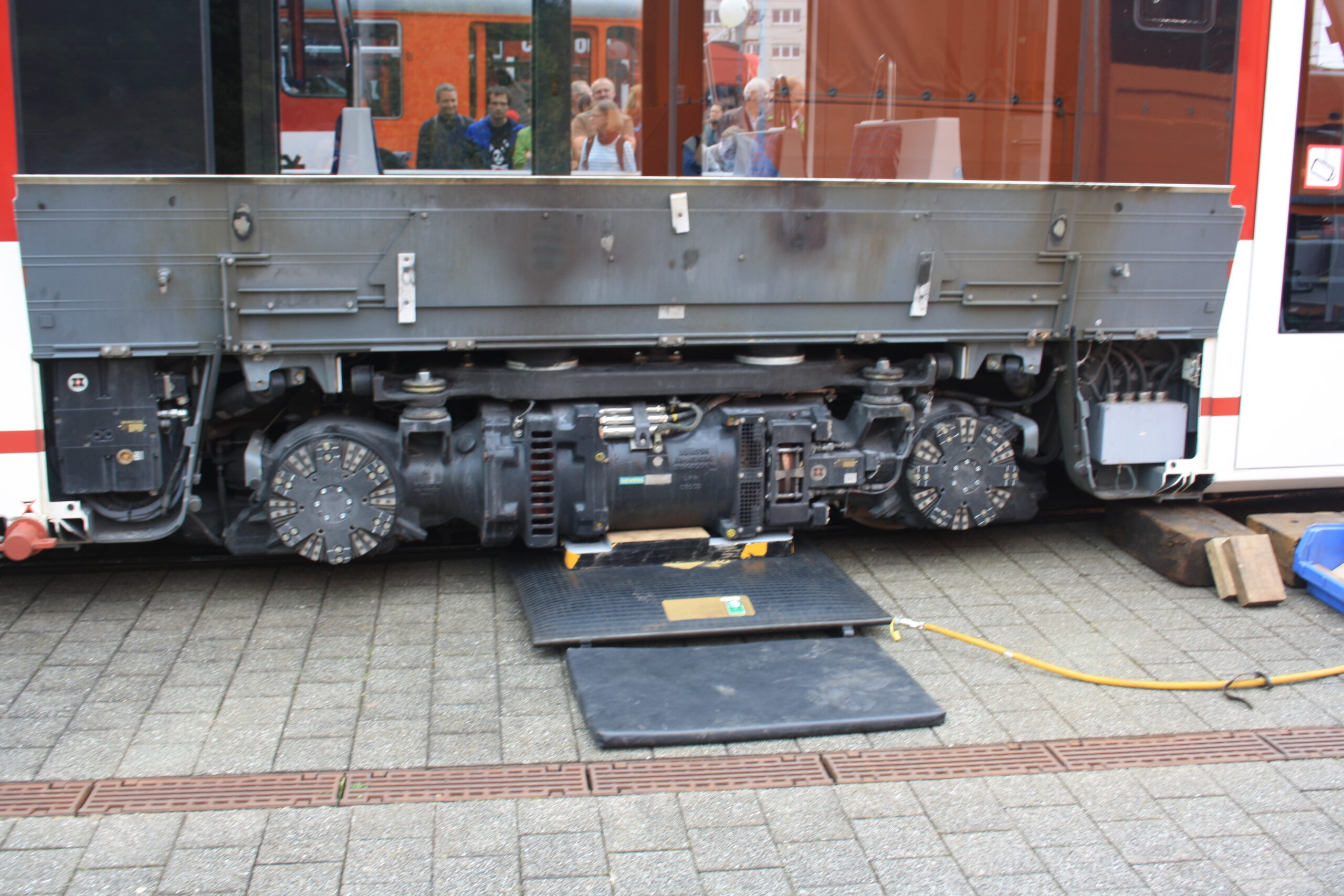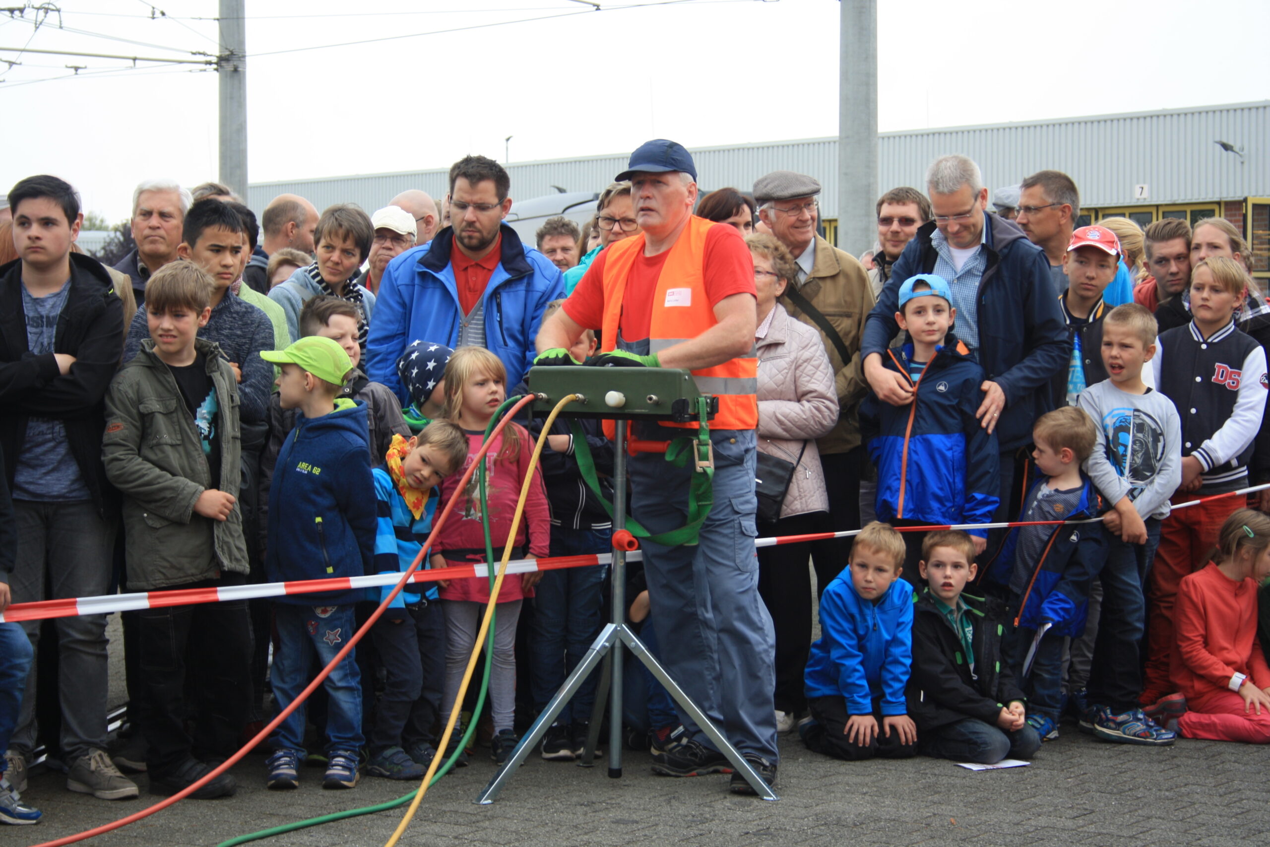 Eins der Highlights war ohne Frage die Eingleisübung an einer Straßenbahn. Viele Besucher wollten unbedingt dabei sein. Warum Bahnen manchmal eingegleist werden müssen? Das wird notwendig, wenn es besonders schwere Unfälle gibt, beispielsweise mit einem Auto.