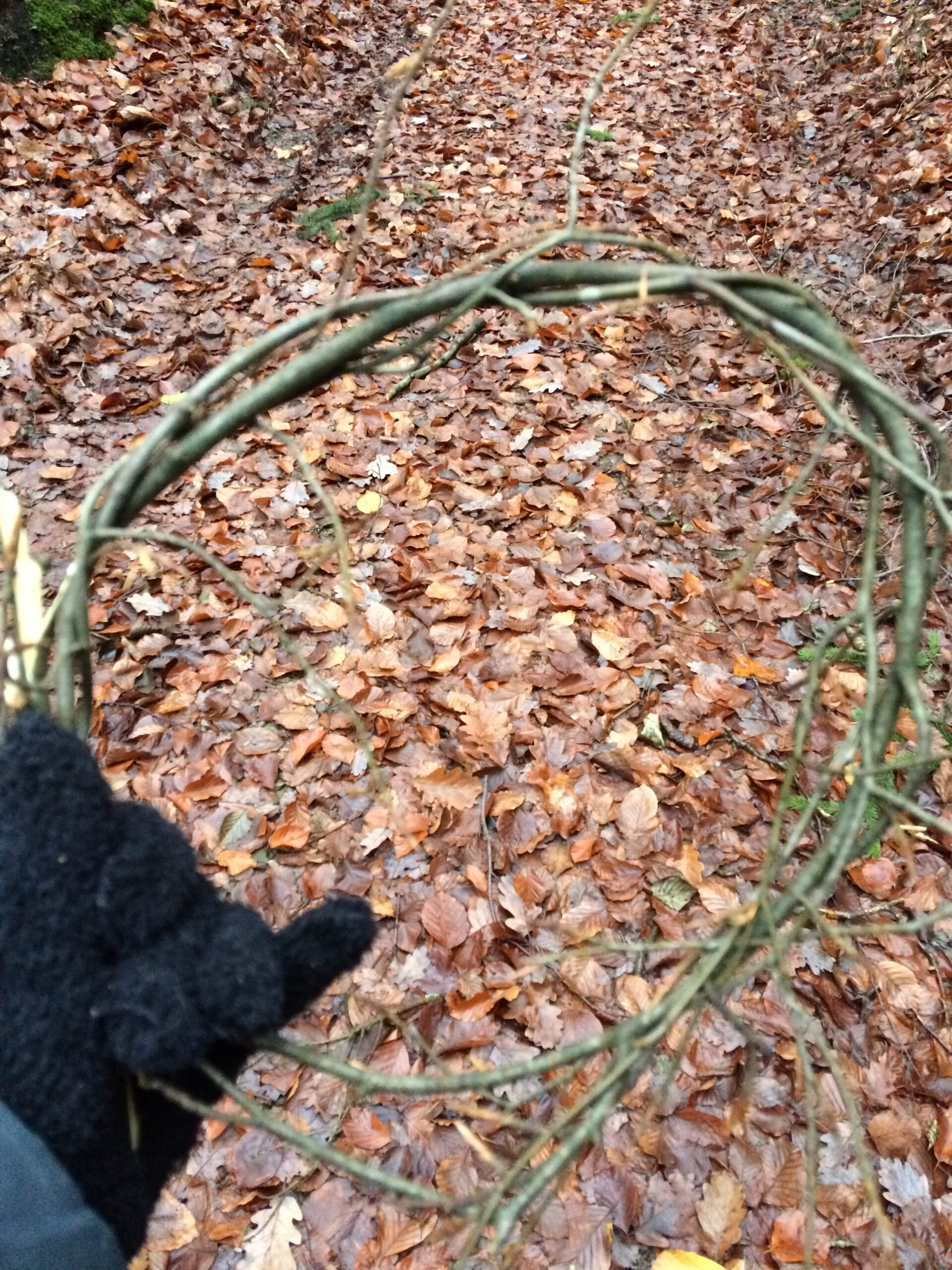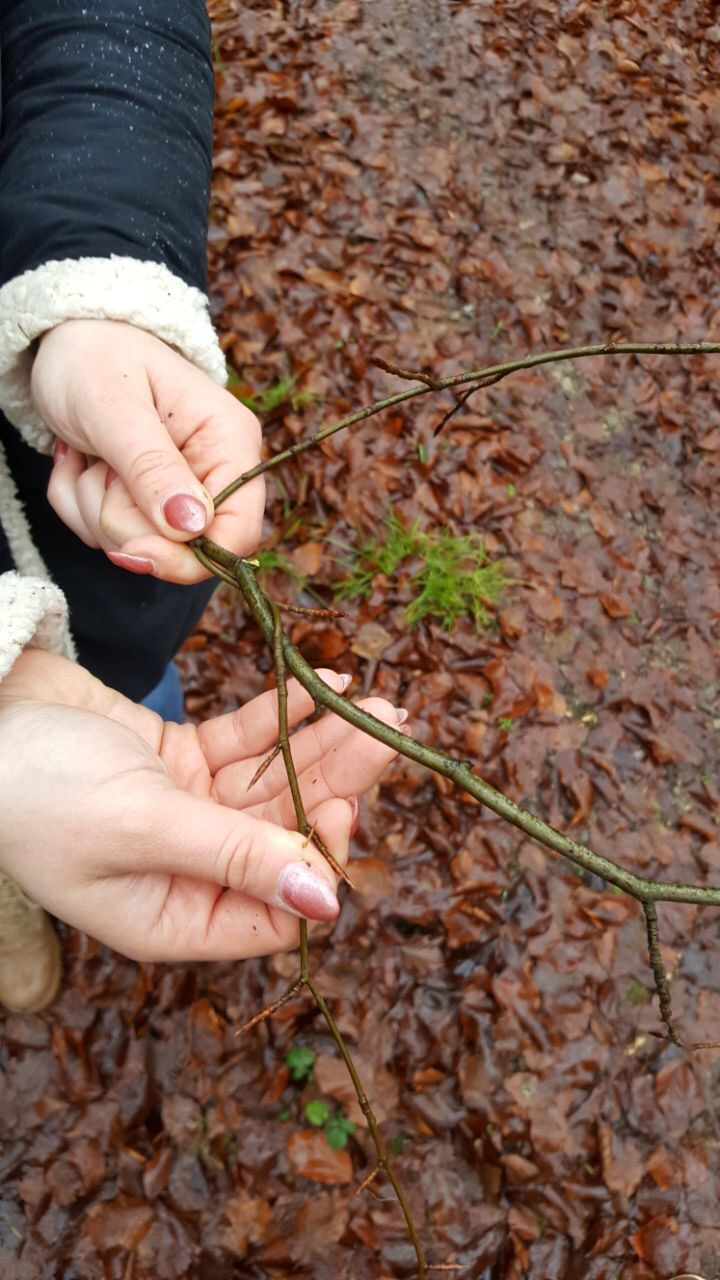 Achtet darauf, am Boden liegende Äste zu nehmen, denn das Abreißen oder Abschneiden von Ästen ist verboten. Ich kann euch aber absolut versichern, dass ihr auch so genügend Holz finden werdet. Je nachdem wie groß euer Kranz werden soll, sucht ihr euren ersten Zweig aus und formt ein „O“. Den Zweig haltet ihr mit einer Hand, sodass er die Form behält und wickelt euren zweiten Zweig um die noch offene Stelle herum. Das macht ihr mit ein paar zusätzlichen Zweigen solange, bis diese Stelle geschlossen ist und die gewollte Form – ohne dass ihr festhalten müsst – bleibt.