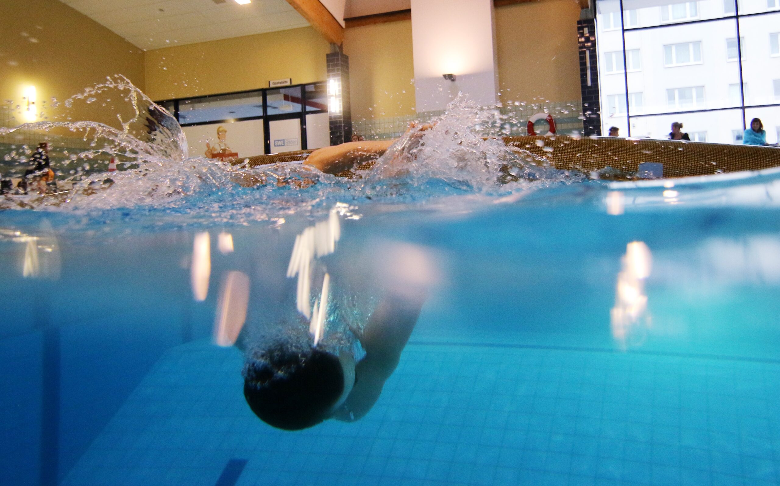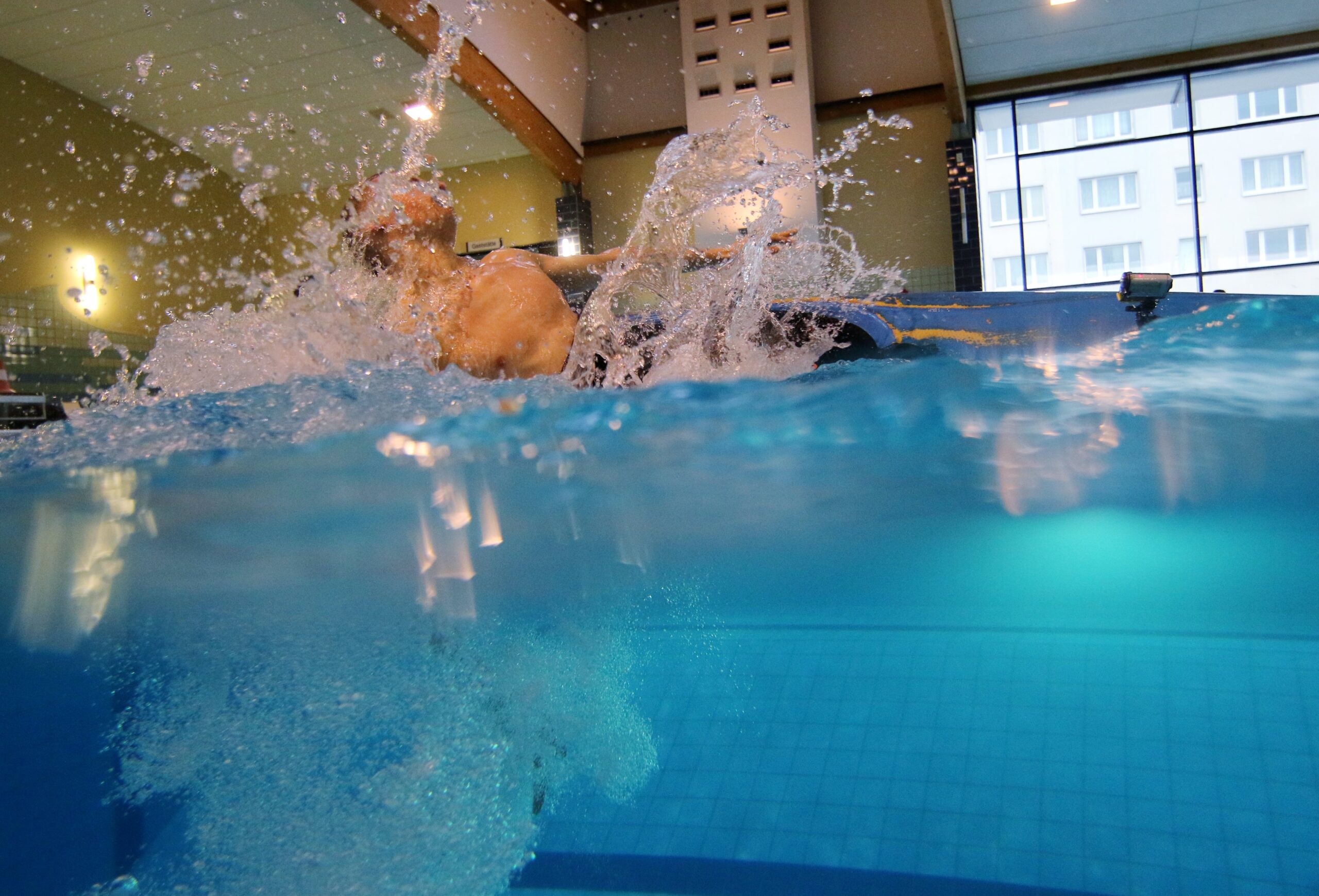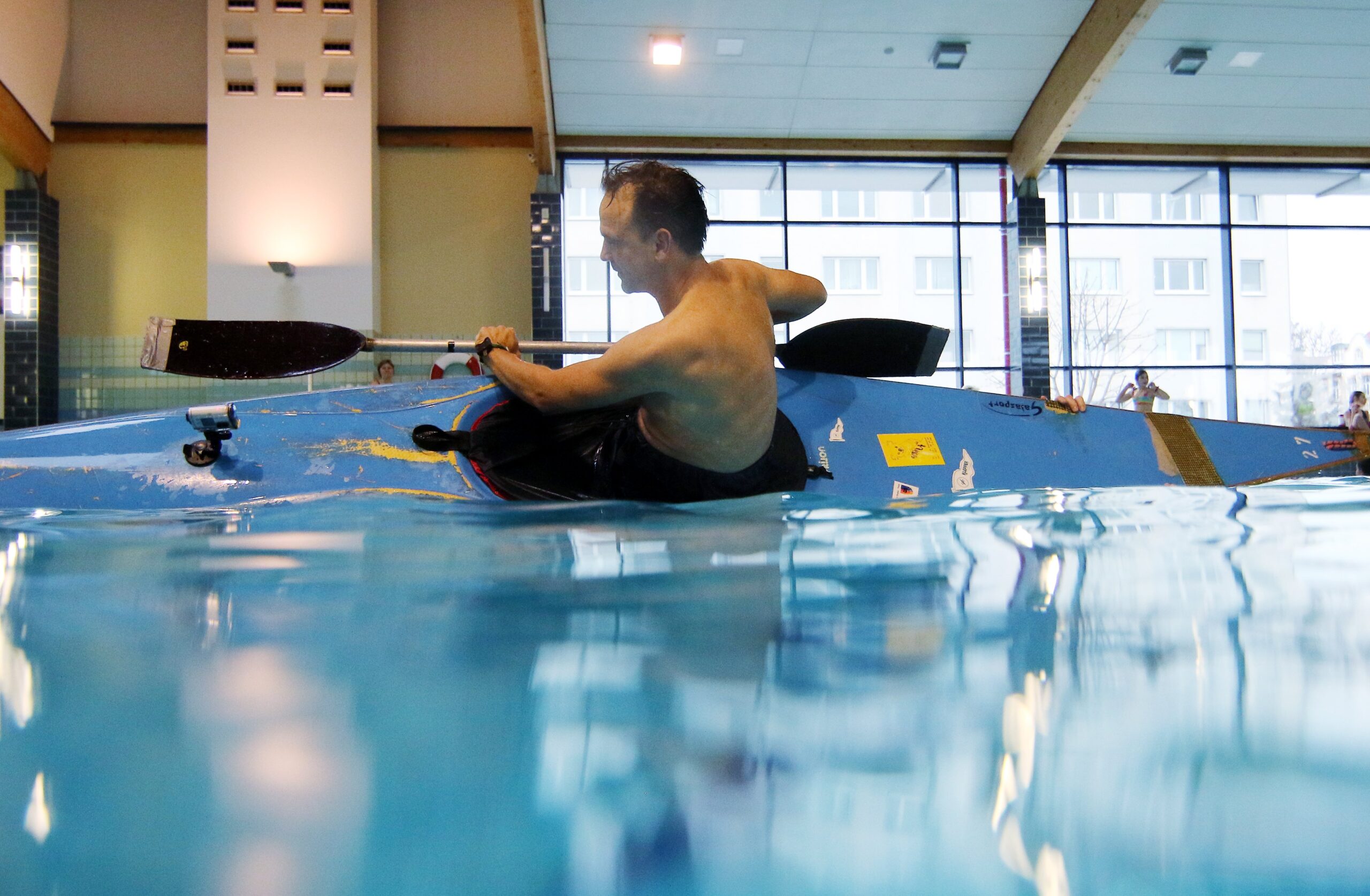 Angekommen. Die Schwimmhalle ist voll. Klar. Tag der offenen Tür. Also sehen mich viele Menschen. Das Beruhigende: Unter den Menschen sind viele Rettungsschwimmer. Im Kinderbecken sehe ich schon das Kanu – oder ist es ein Kajak? Ich bin kein Profi, wird mir wieder bewusst. Die Menschen am Kajak outen sich als Kanusportler. Ich äußerte meinen Wunsch. Warum sagte ich nur tiefes Wasser? Übermut? Normalerweise wird die Kenterrolle zuerst im flachen Wasser geübt. Aber ich will den Crashkurs. Crash im wahrsten Sinn des Wortes. Habe ja nur 20 Minuten. Also ab ins tiefe Wasser.