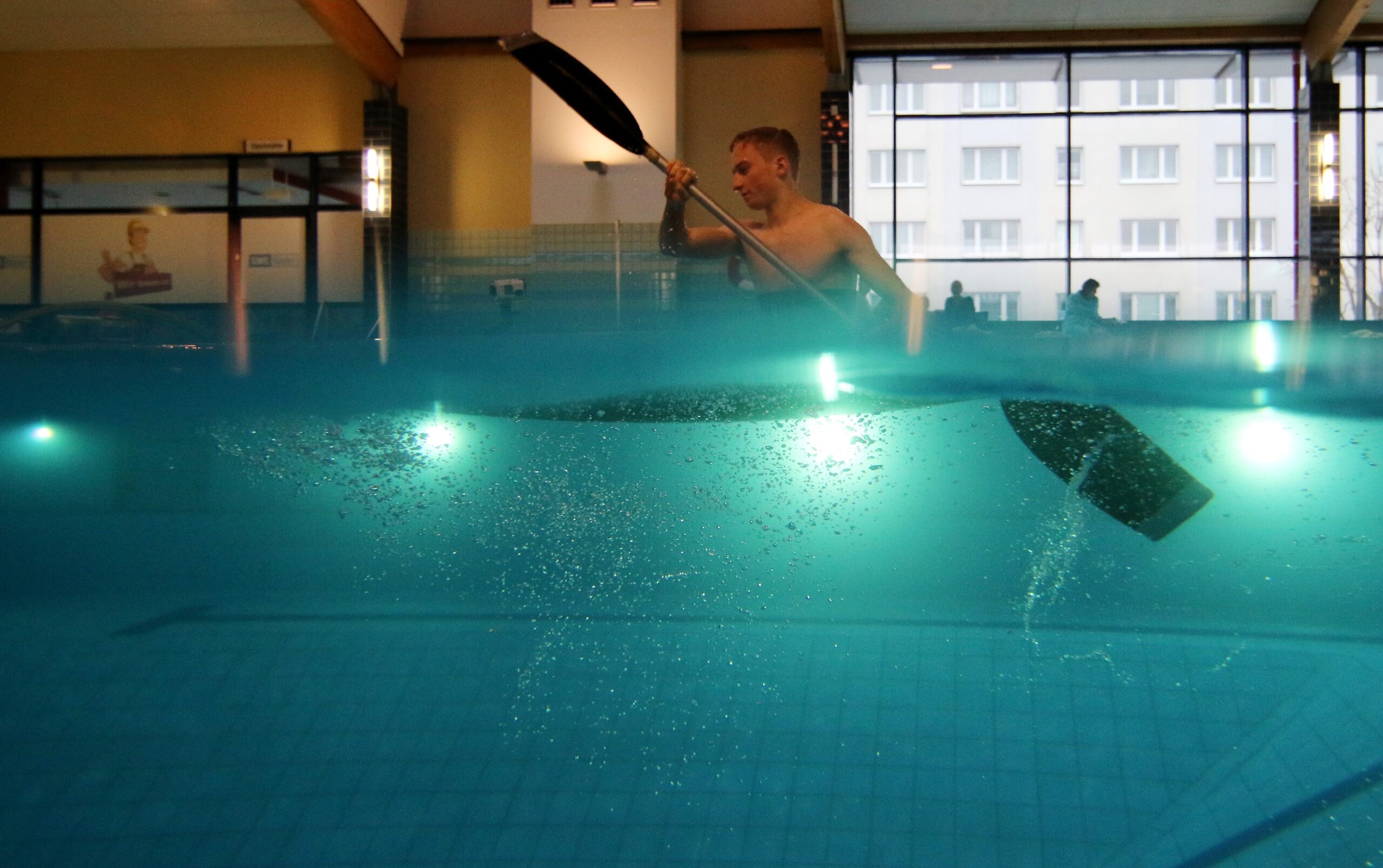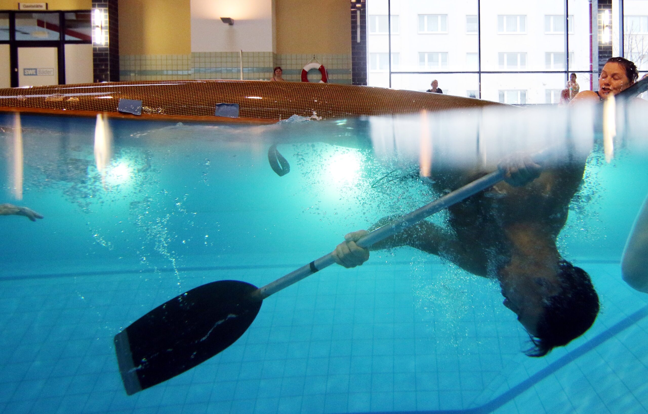 Um das zu erfahren, passte es gut, dass die Schwimmhalle Johannesplatz einen „Tag der offenen Tür“ veranstaltete. Kanusportler vom SV Concordia Erfurt e.V. waren vor Ort. Sie lernen genau diese Technik – die auch Eskimorolle oder Kenterrolle genannt wird – hier in der Schwimmhalle Johannesplatz.