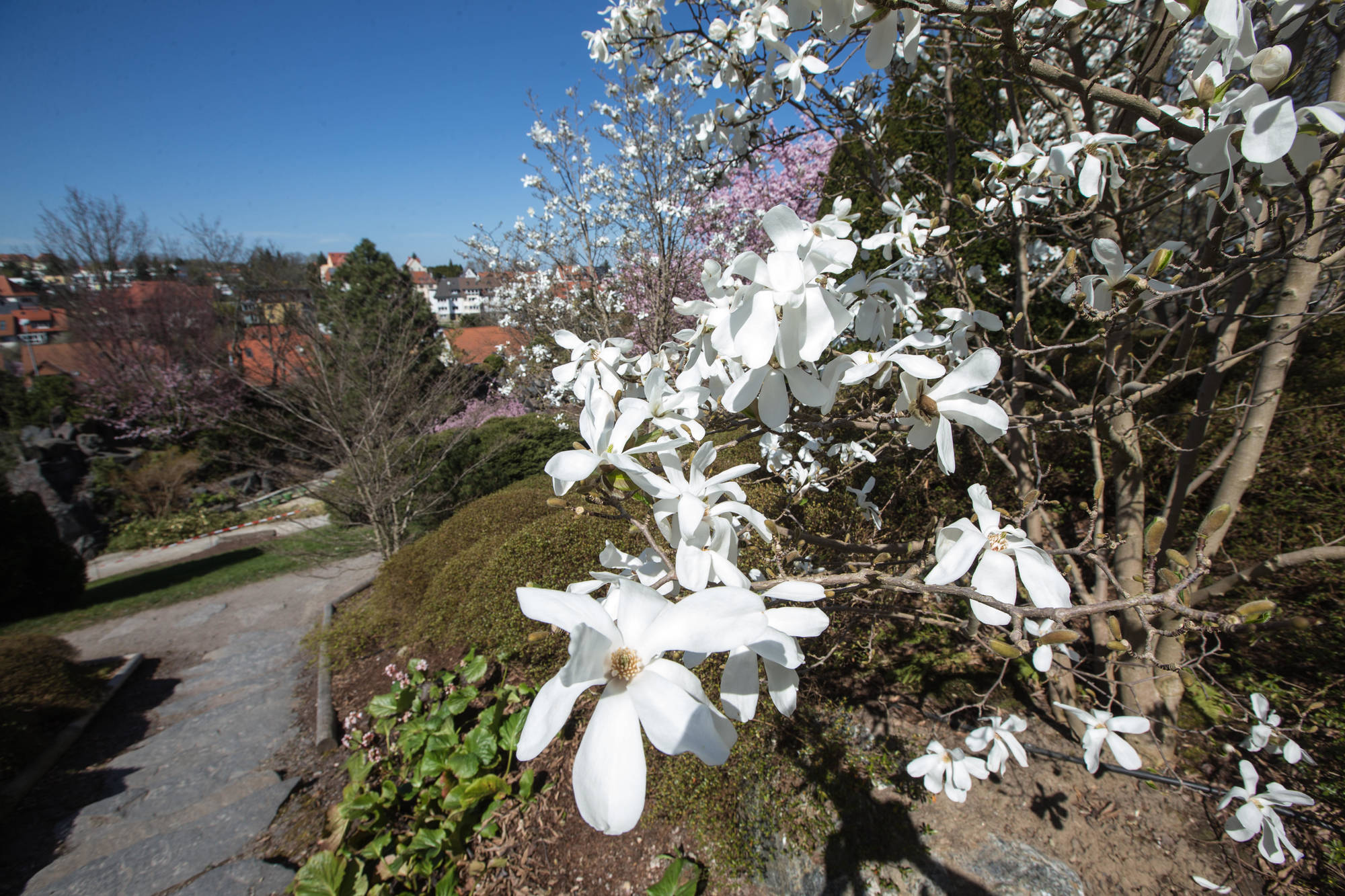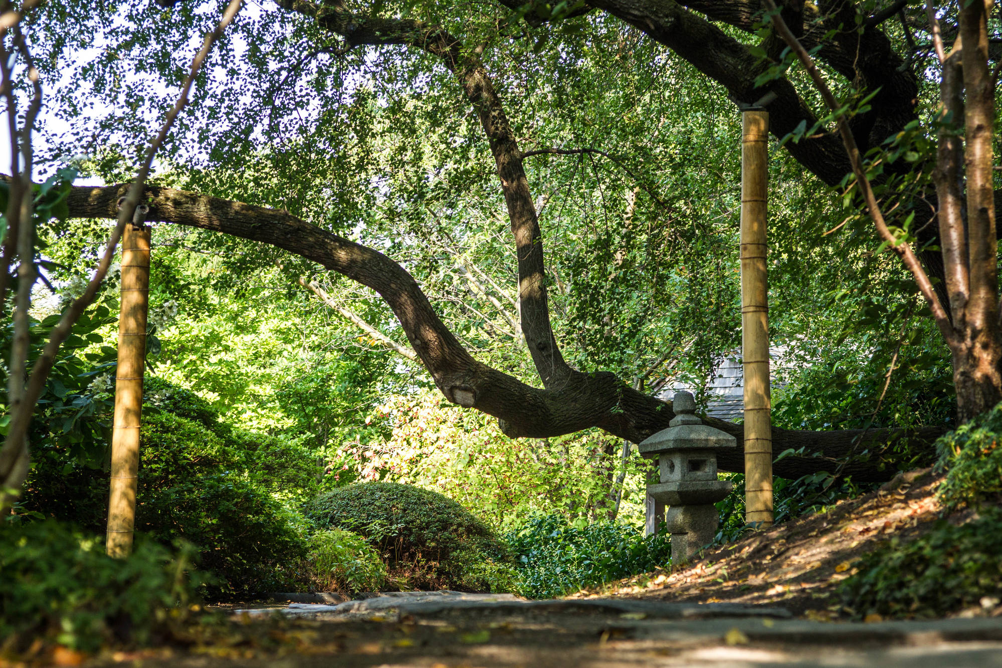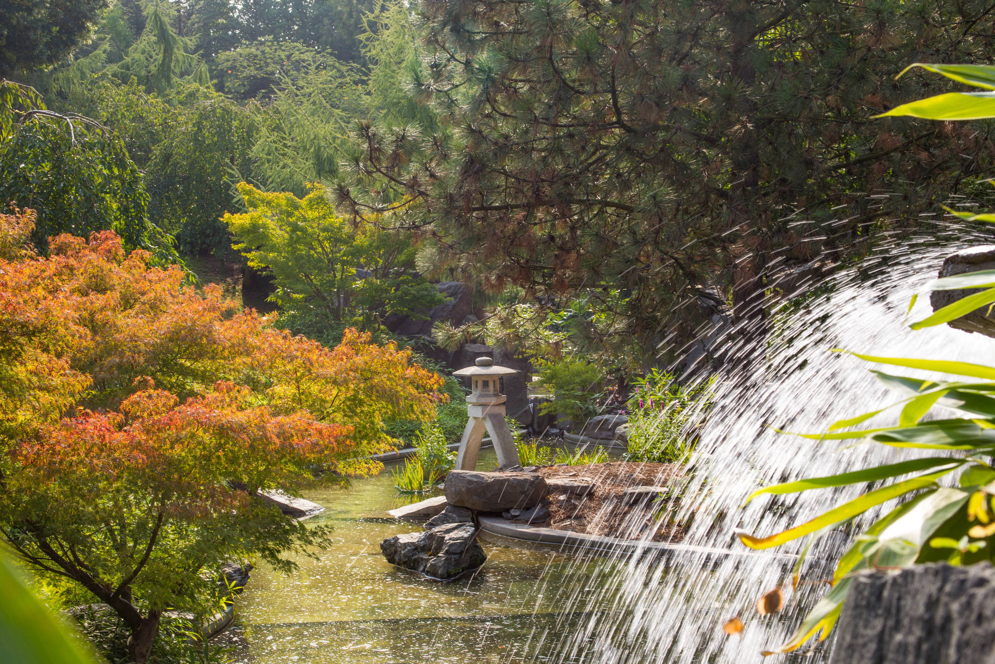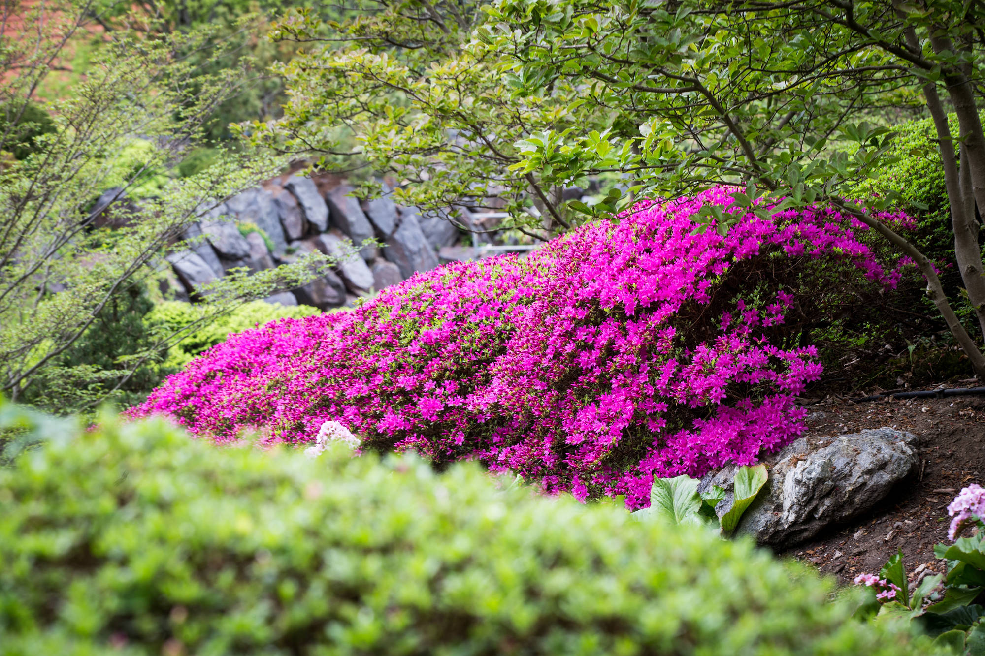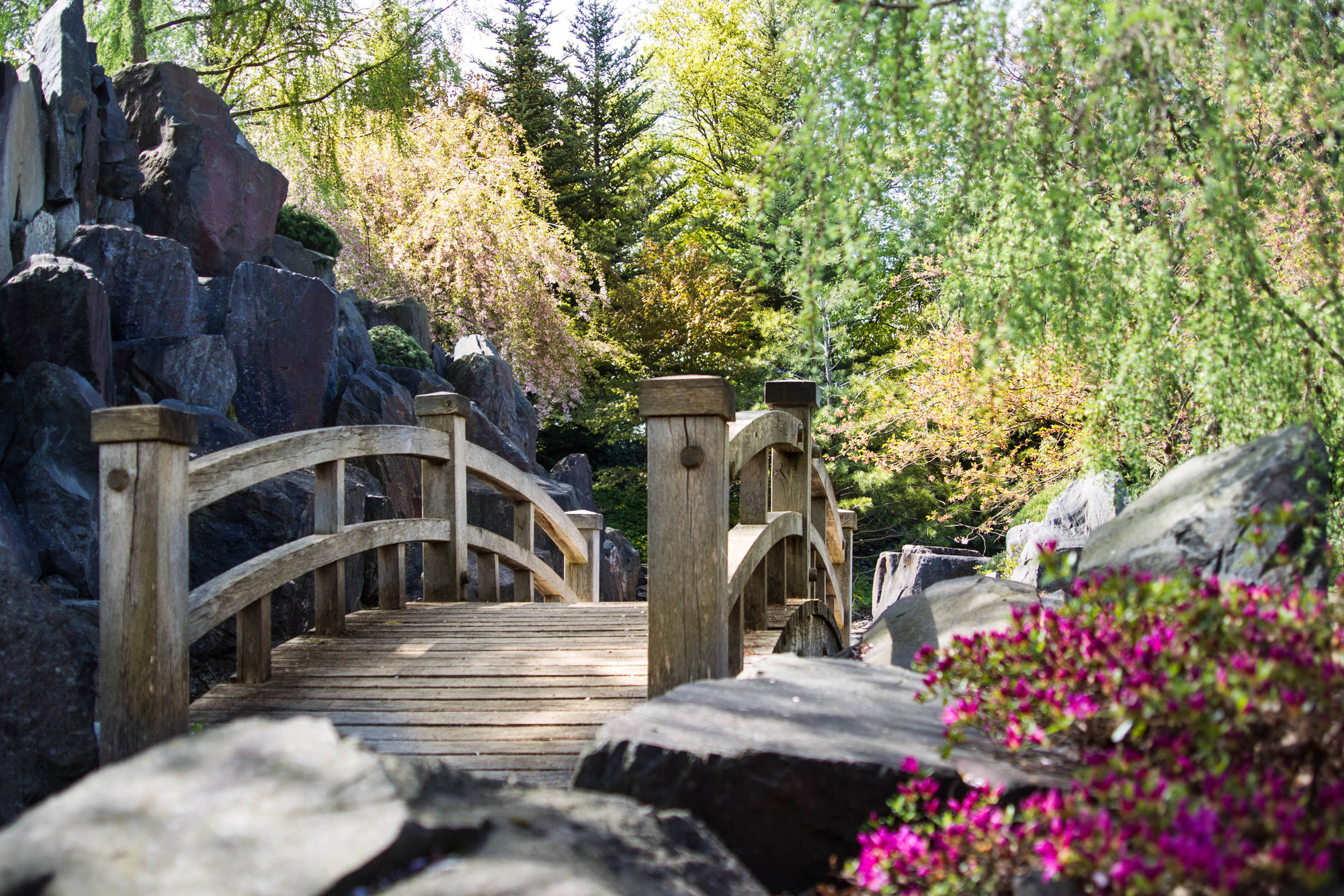 Den Kirschblüten folgen die Azaleen in kräftigen Pink- und Rosatönen. In Komposition mit zarten pastellfarbenen Pfingstrosen und blütenprallen Rhododendren setzen sie Farbakzente in das satte Grün von Bambus, Farn und Nadelgehölzen. Der Fächerahorn zeigt seine besonderen Reize im Herbst, wenn sich das Laub dunkelrot färbt.