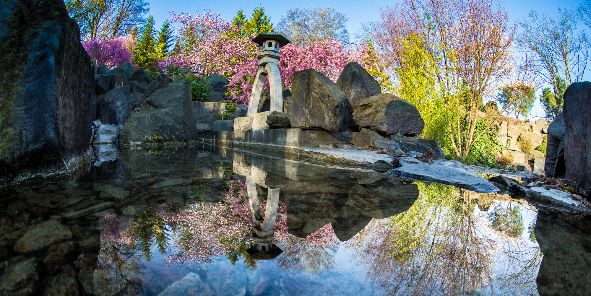 Den Japanische Fels- und Wassergarten zieren Kirschbäume mit weißer und rosafarbener Blütenpracht. Mitte April stehen sie in voller Blüte. Nur rund zehn Tage dauert die Kirschblüte und taucht den Garten für kurze Dauer in ein Farbenmeer aus rosafarbenen und weißen Blüten. Aufgrund ihrer Pracht und Kurzlebigkeit ist sie in Japan ein Symbol für Schönheit, Zerbrechlichkeit und Aufbruch. Die Japaner feiern die Kirschblüte mit ihrer Familie unter den Kirschbäumen. Dieses gesellige japanische Fest, Hanami, ist auch im egapark ein fester Termin im Kalender.