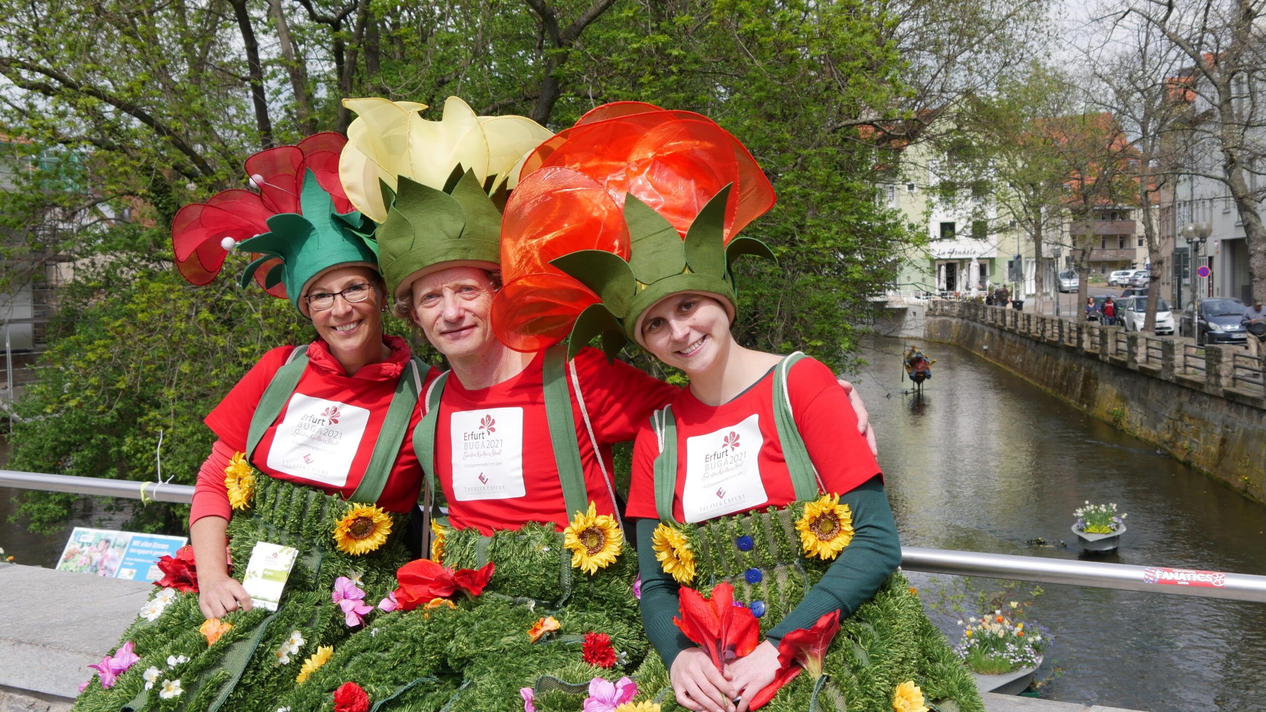 Unsere Blumen heißen nicht Rose, Tulpe, Nelke – sondern Andrea, Cathleen und Michael. Okay, die drei sind „Kunstblumen“ und gehören zur Statisterie des Theaters Erfurt. Dessen Expertinnen haben extra für die BUGA 2021 Hand angelegt.