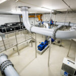 Anschließend steigen wir mit Andreas Degelmann, verantwortlich für die Wassergewinnung der ThüWa, in eine Brunnenkammer hinab: Rohre, Pumpen, Zähler und eine UV-Behandlungsanlage. Wasser sieht man hier nirgendwo, das befindet sich weit unter uns in den wasserführenden Bodenschichten. Die Brunnenfassung ist ein tiefes Rohr mit Bohrungen in verschiedenen Höhen. 15 Tiefbrunnen gibt es im Wasserwerk. In einer Tiefe von 30 m wird heute angezapft und Grundwasser in die Wasserwerksanlagen gepumpt. Entscheidend für die Entnahmehöhe ist die Qualität des Rohwassers. Nach minimaler Chlorierung (ein Zehntel des erlaubten Wertes) und einer Behandlung mit ultravioletten Strahlen strömt das Grundwasser in Richtung der Hochbehälter. 26 gibt es davon im ThüWa-Netz. Sie dienen als Speicher, so kann die Wasserversorgung auf die unterschiedliche Nachfrage im Tagesverlauf reagieren und gleichmäßig liefern. Sie stehen oberhalb der Stadt, das Wasser nutzt für seinen Weg das natürliche Gefälle. Das Prinzip kannten bereits die Erbauer der ersten leitungsgebundenen Wasserversorgung für Erfurt im Jahre 1876.