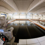 Direkt hinter der Staumauer steht die Energiegewinnungsanlage, Wasser rauscht in lautem Schwall aus einem Rohr in einen offenen Kanal. Wir werden schon von Wasserfachmann Falko Hallebach erwartet. „1,5 GWh Strom aus Wasserkraft können hier pro Jahr erzeugt werden, das reicht für den Eigenbedarf und eine satte Überschusseinspeisung ins Stromnetz“, erzählt der Leiter des Meisterbereiches Luisenthal der Thüringer Fernwasserversorgung. Wir gehen in die Aufbereitungsanlage, hier wird Rohwasser zu Trinkwasser. Das Wasser wird in riesigen Hochbehältern gespeichert und strömt von dort in die Teilstromaufhärtung. Über Calziumcarbonatfilter geleitet, wird die im Wasser enthaltene aggressive Kohlensäure in Hydrogencarbonat umgewandelt, entsäuert, sagt der Fachmann. „Das vorher noch saure Wasser würde die Rohrleitungen angreifen. Das ebenfalls zugefügte Eisen-(III)-Chlorid bindet kleinste Schmutzpartikel, die dann herausgefiltert werden können. Natronlauge dient zum Einstellen eines konstanten pH-Wertes“, erklärt der Fachmann. Weiter geht es: In der Halle herrscht eine besondere Stille, es ist kühl. In 14 Becken, offenen Mehrschichtfiltern, wird aus dem Rohwasser nun Trinkwasser. Ca. 15 Minuten Verweildauer pro Filter sind notwendig. Trübung, Eisen- und Manganverbindungen sowie Schwebstoffe werden hier auf konstante Werte eingestellt.