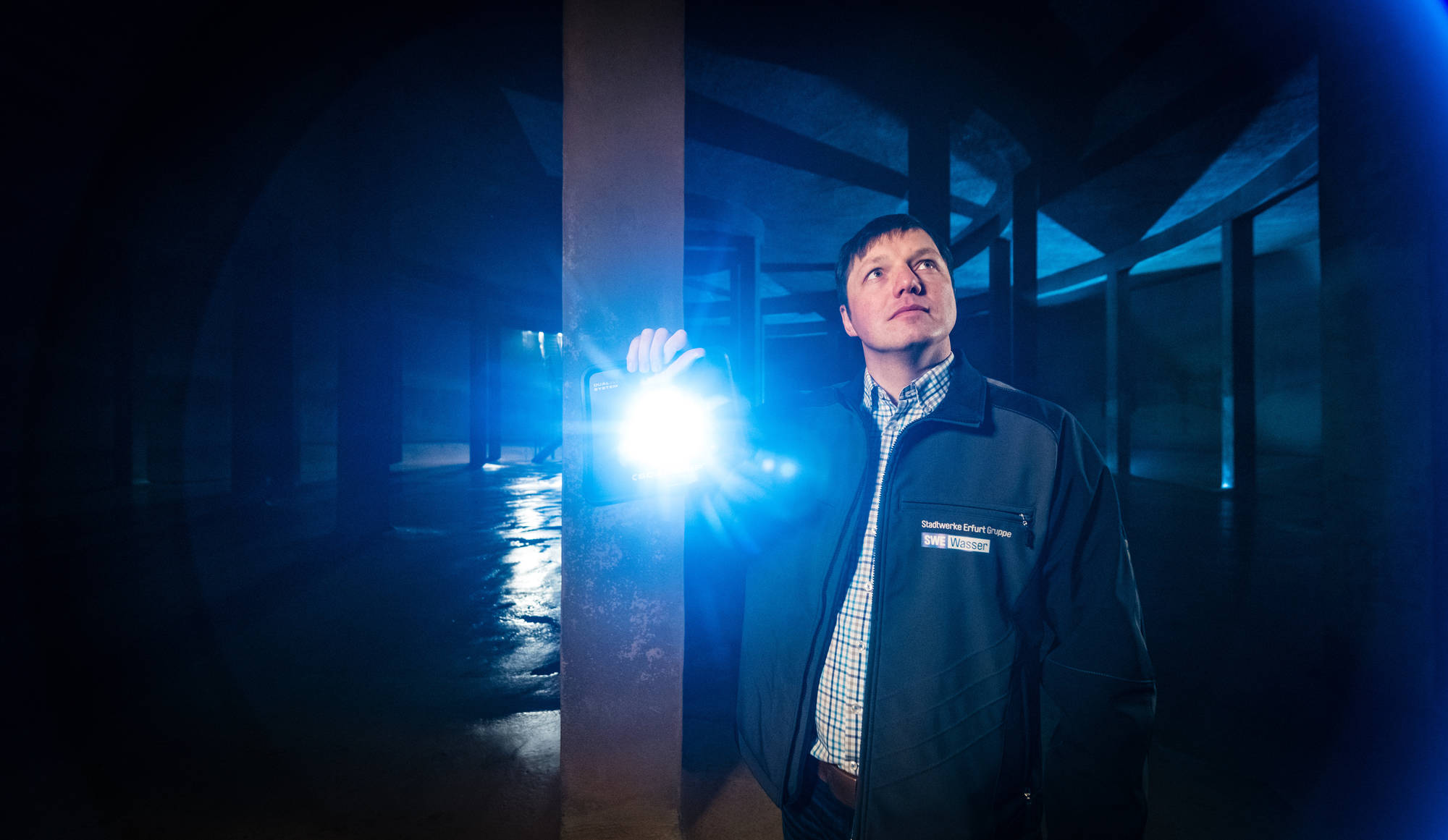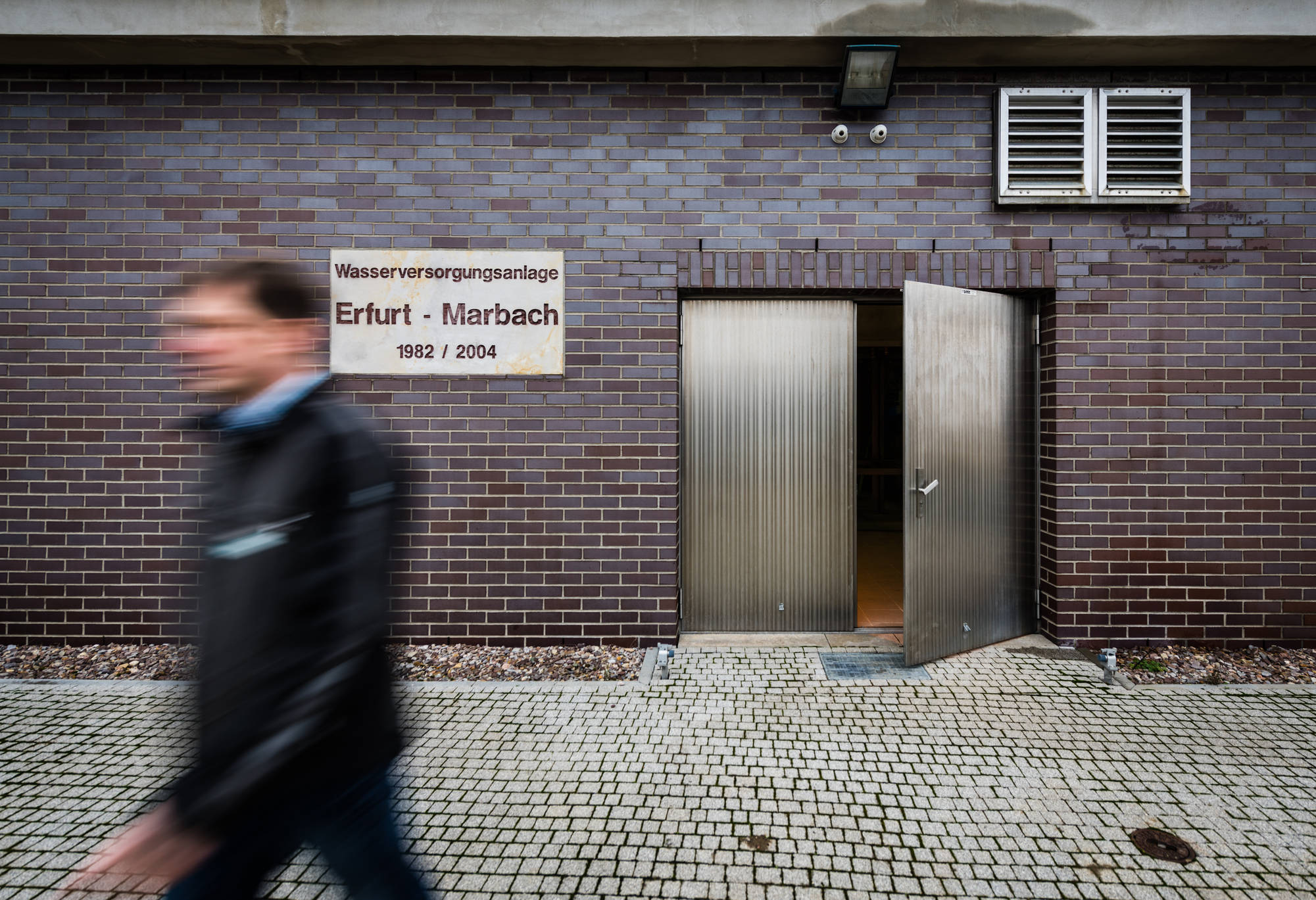 Anschließend steigen wir mit Andreas Degelmann, verantwortlich für die Wassergewinnung der ThüWa, in eine Brunnenkammer hinab: Rohre, Pumpen, Zähler und eine UV-Behandlungsanlage. Wasser sieht man hier nirgendwo, das befindet sich weit unter uns in den wasserführenden Bodenschichten. Die Brunnenfassung ist ein tiefes Rohr mit Bohrungen in verschiedenen Höhen. 15 Tiefbrunnen gibt es im Wasserwerk. In einer Tiefe von 30 m wird heute angezapft und Grundwasser in die Wasserwerksanlagen gepumpt. Entscheidend für die Entnahmehöhe ist die Qualität des Rohwassers. Nach minimaler Chlorierung (ein Zehntel des erlaubten Wertes) und einer Behandlung mit ultravioletten Strahlen strömt das Grundwasser in Richtung der Hochbehälter. 26 gibt es davon im ThüWa-Netz. Sie dienen als Speicher, so kann die Wasserversorgung auf die unterschiedliche Nachfrage im Tagesverlauf reagieren und gleichmäßig liefern. Sie stehen oberhalb der Stadt, das Wasser nutzt für seinen Weg das natürliche Gefälle. Das Prinzip kannten bereits die Erbauer der ersten leitungsgebundenen Wasserversorgung für Erfurt im Jahre 1876.
