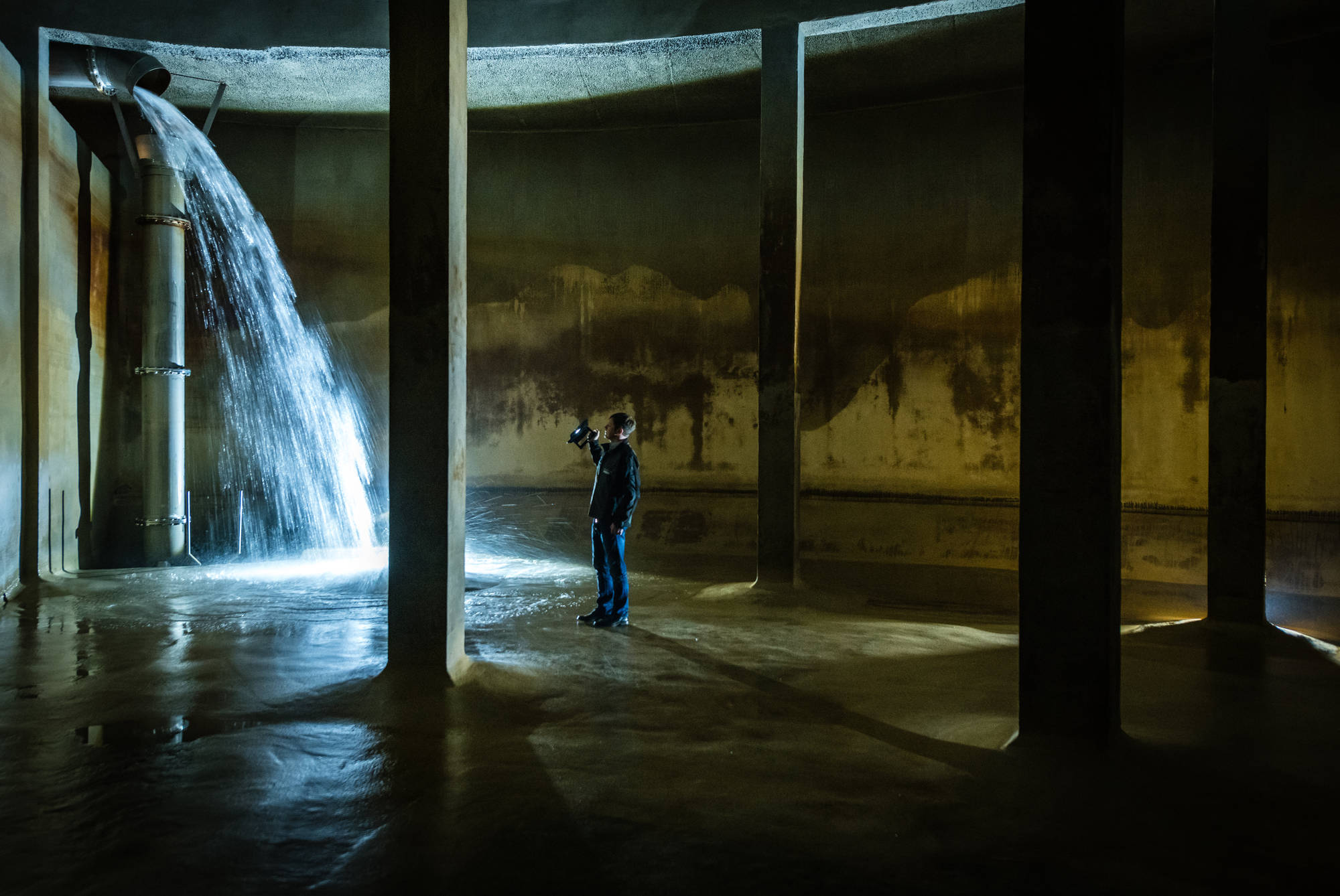Wir steigen in eine Kammer des Hochbehälters, die für Wartung und Reinigung entleert wurde. Treppen führen ca. 12 m tief hinab. Hohe Säulen tragen das Bogengewölbe, Optik und Akustik erinnern an eine Kirche. 5000 m³ Wasser werden in ein paar Tagen nach erfolgter Reinigung der Speicherkammer wieder eingefüllt. Wir werfen einen Blick in die zweite, gefüllte Behälterkammer. Das 8 ° Celsius kühle Wasser steht bis ca. drei Meter unter dem Eingang und schillert türkis und klar, fast wie das Meer.