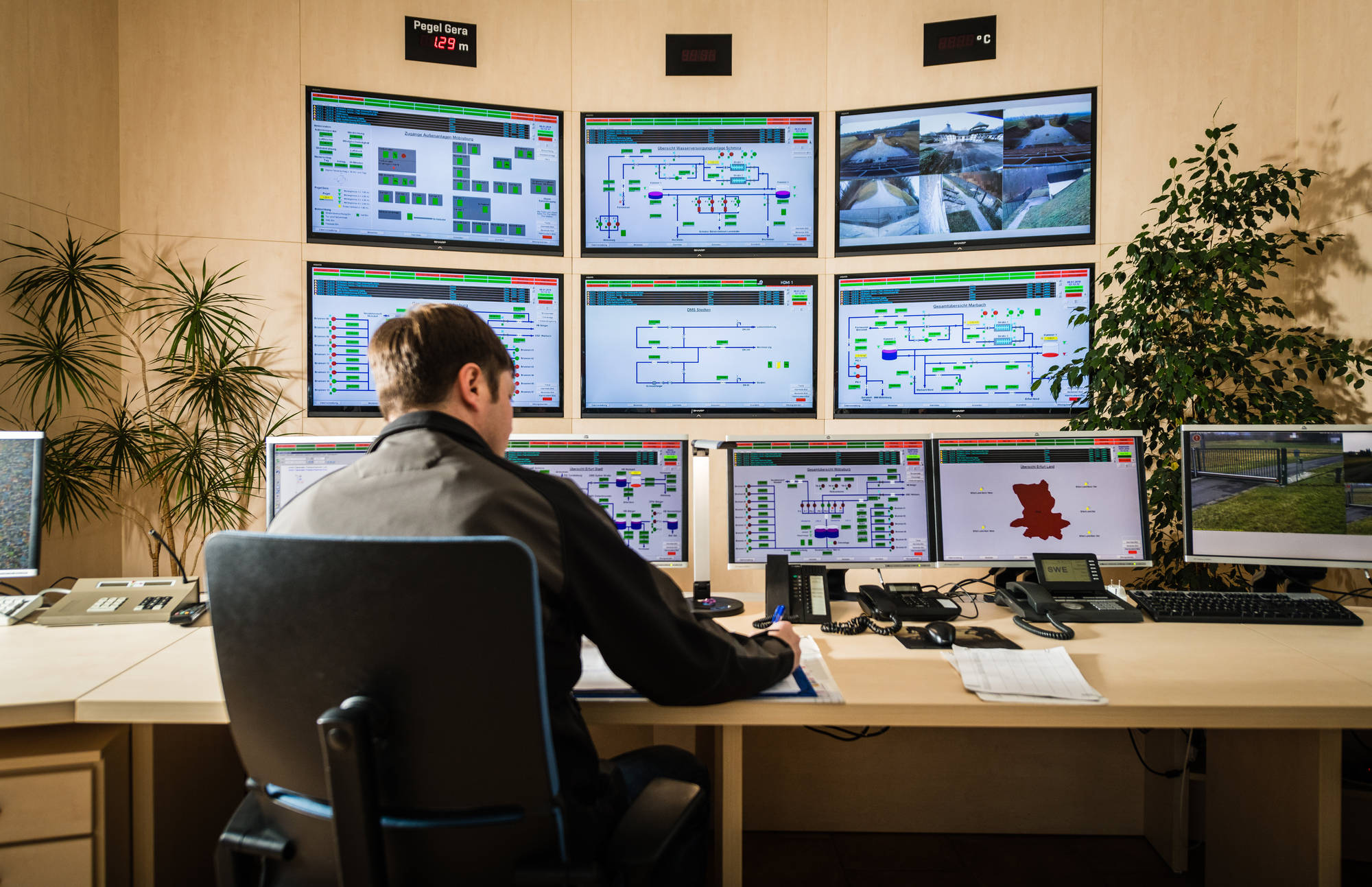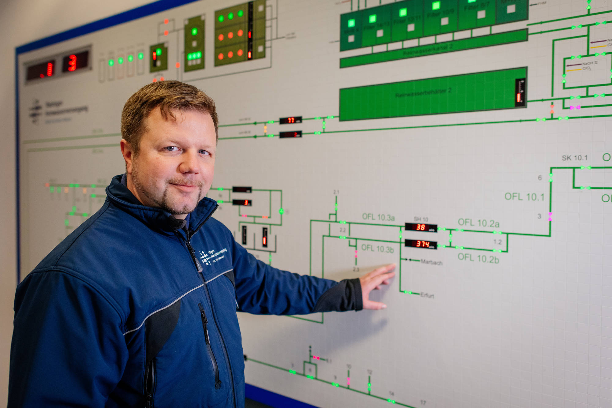 Während das Ohra-Wasser durch riesige Rohre mit einem Durchmesser von 1 Meter gen Erfurt rauscht, machen wir uns auf den Weg nach Erfurt-Möbisburg zum Wasserwerk der Stadtwerketochter ThüWa ThüringenWasser GmbH. Auf dem mehrere Hektar großen, eingezäunten Grundstück wird Grundwasser gewonnen. In der Leitwarte ist Erfurts Wasserversorgung schematisch dargestellt. Lämpchen blinken, schwankende Balken zeigen Füllstände an, das Telefon klingelt. Wir sind im Herz der Erfurter Wasserversorgung, hier wird auch registriert, welche Wassermenge aus Luisenthal am Übergabepunkt ankommt.