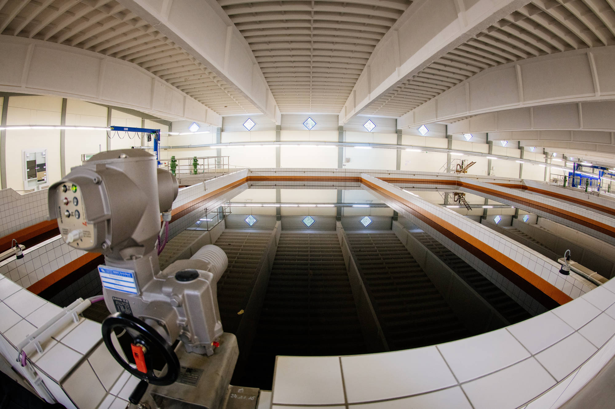 Doch von Anfang an: Wie kommt das Wasser aus dem Stausee in die Leitung? Ganz einfach: Inmitten des Sees steht ein Entnahmeturm, von dort wird die Wasserschicht mit der besten Qualität angezapft. Einmal pro Woche wird getestet und über die Entnahmehöhe entschieden.