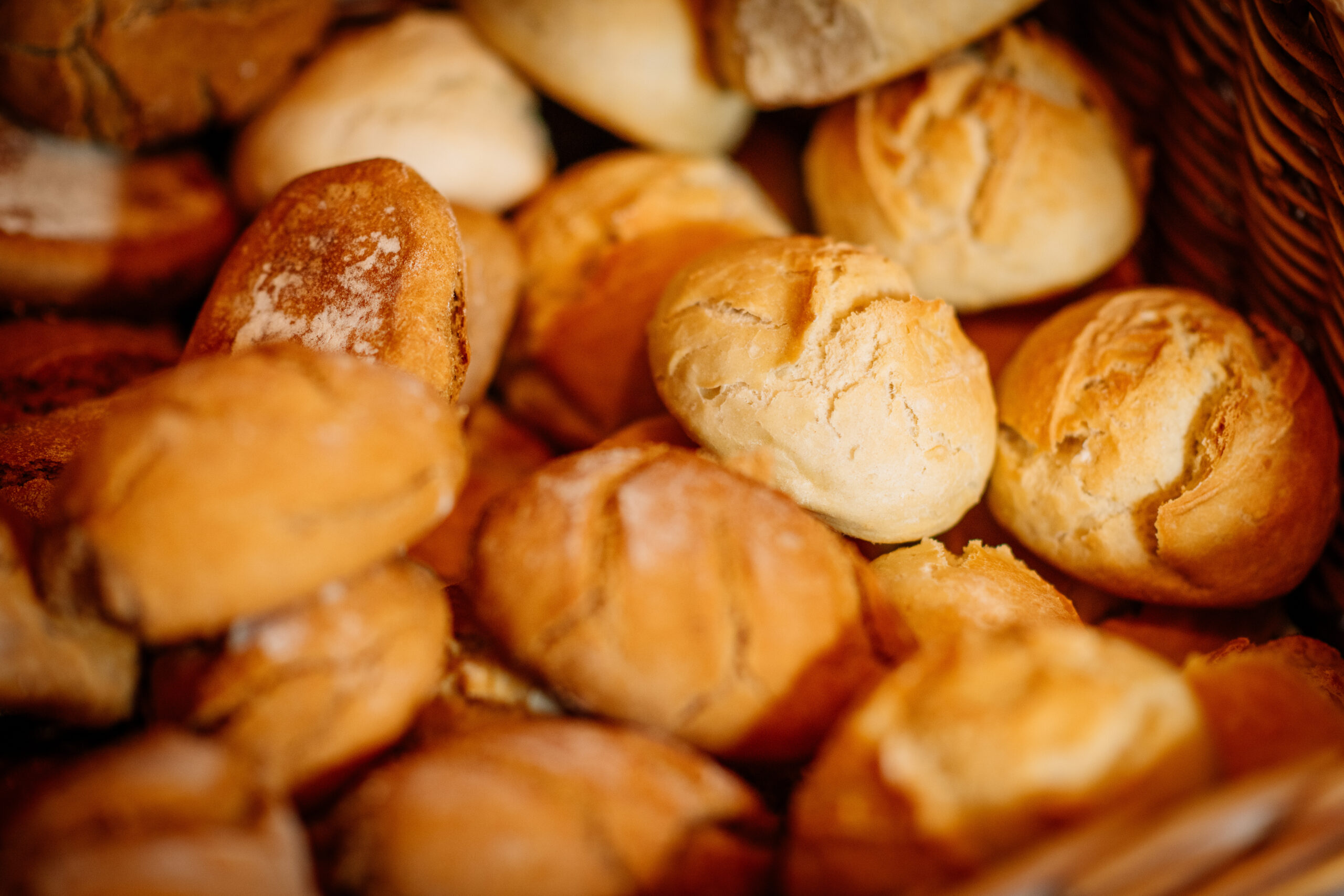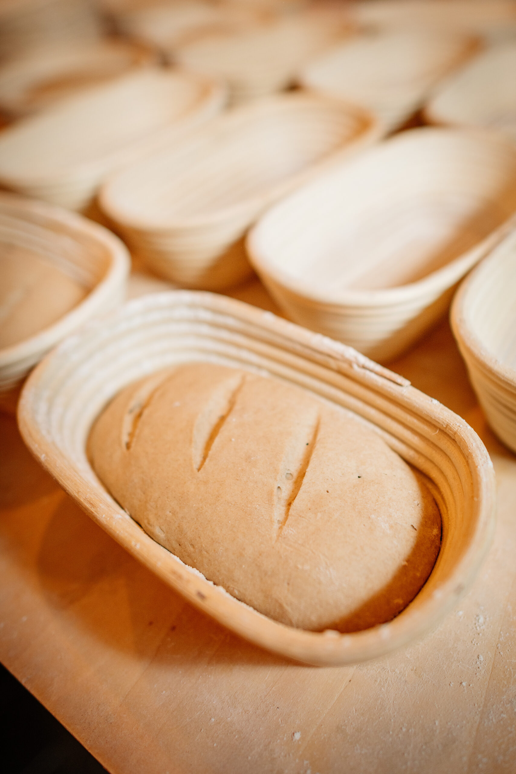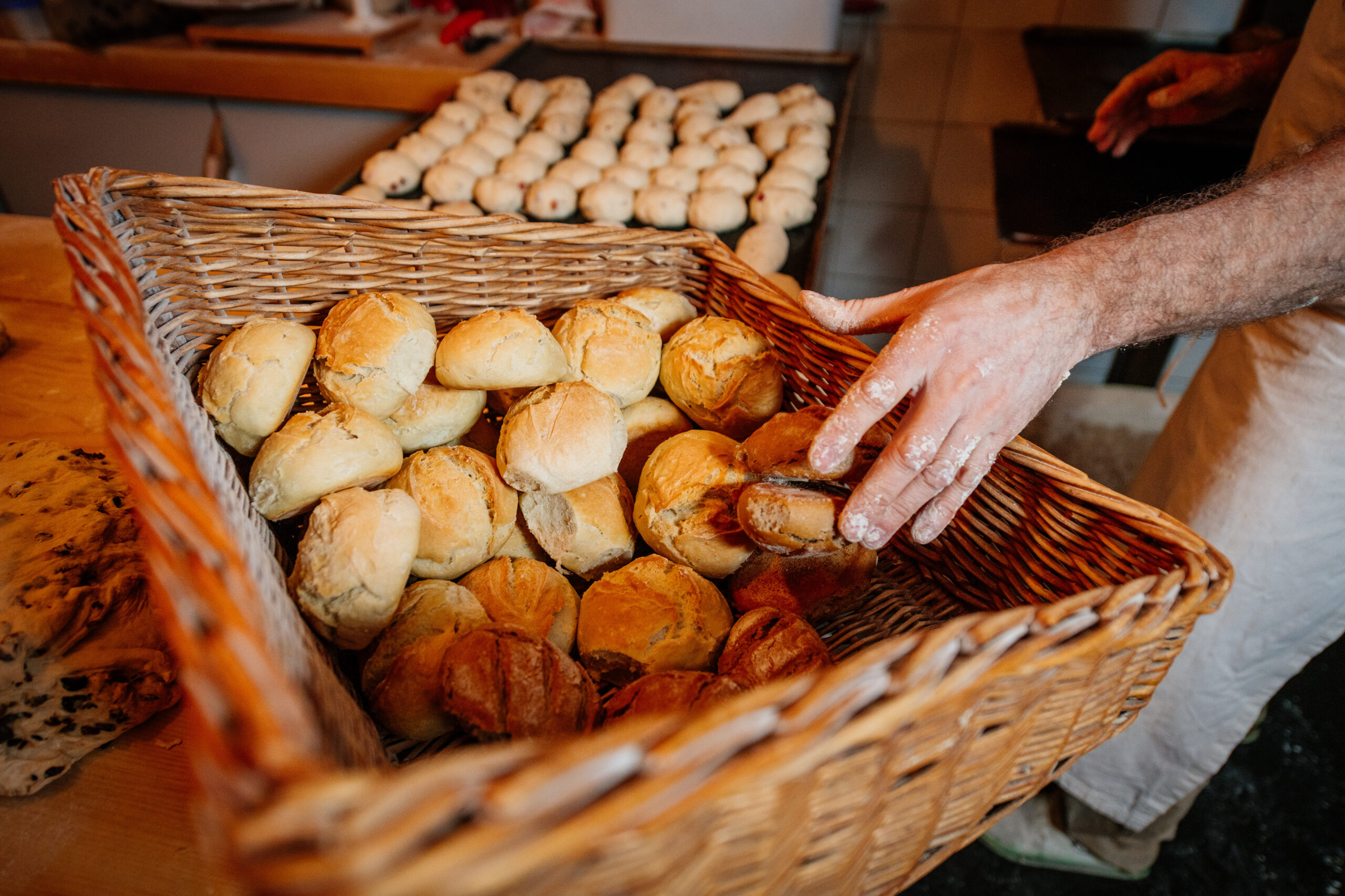 »Die Größe kommt gut an. Da kann man auch mal zwei Sorten kaufen und sie frisch genießen«, sagt Hartmut und greift schon zu den Gärkörbchen aus Peddigrohr, in denen die kleinen Brote ruhen. Sie sind vegan, auch die meisten Brötchen, außer die süßen Varianten, Chorizo und Tiroler Schinken.