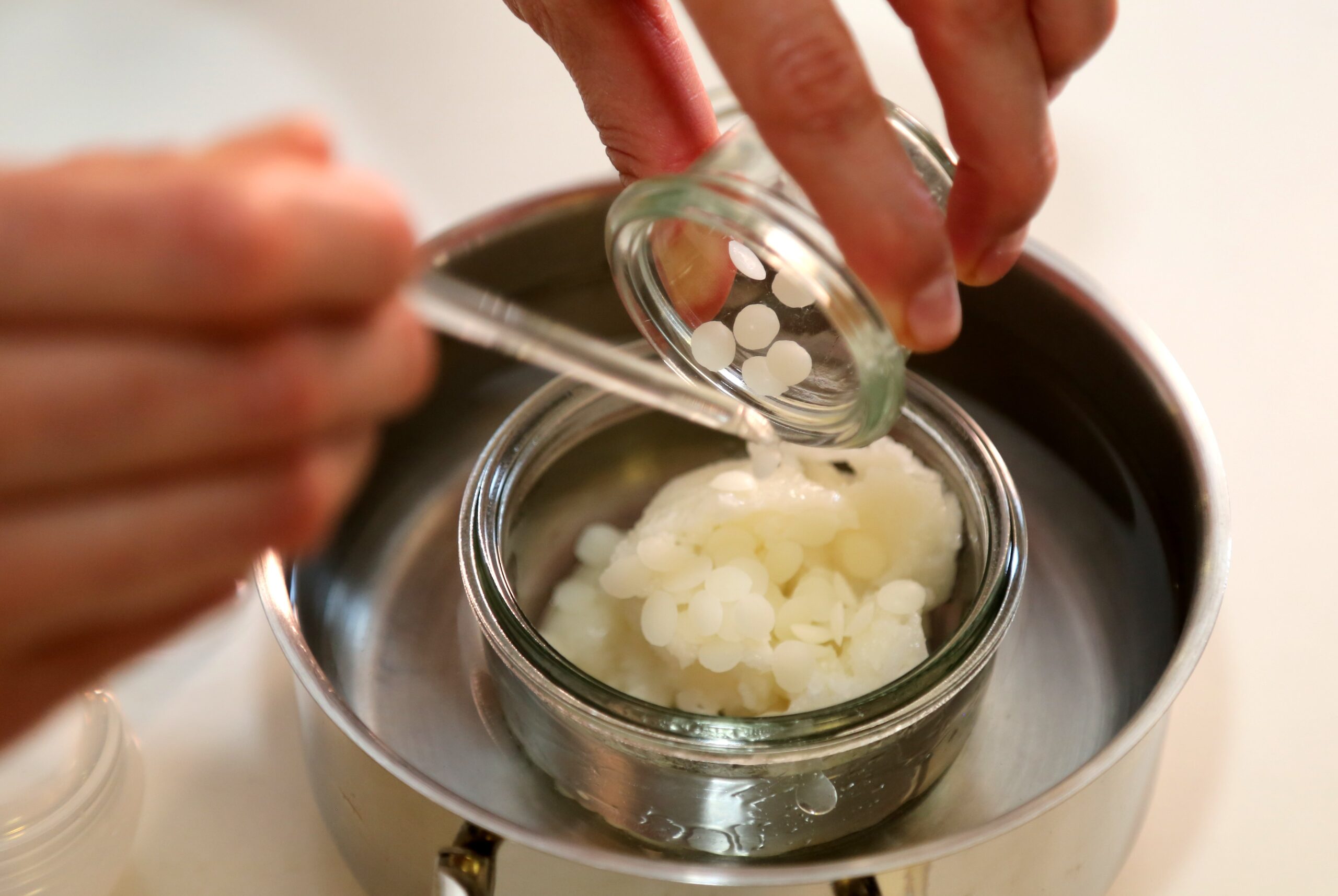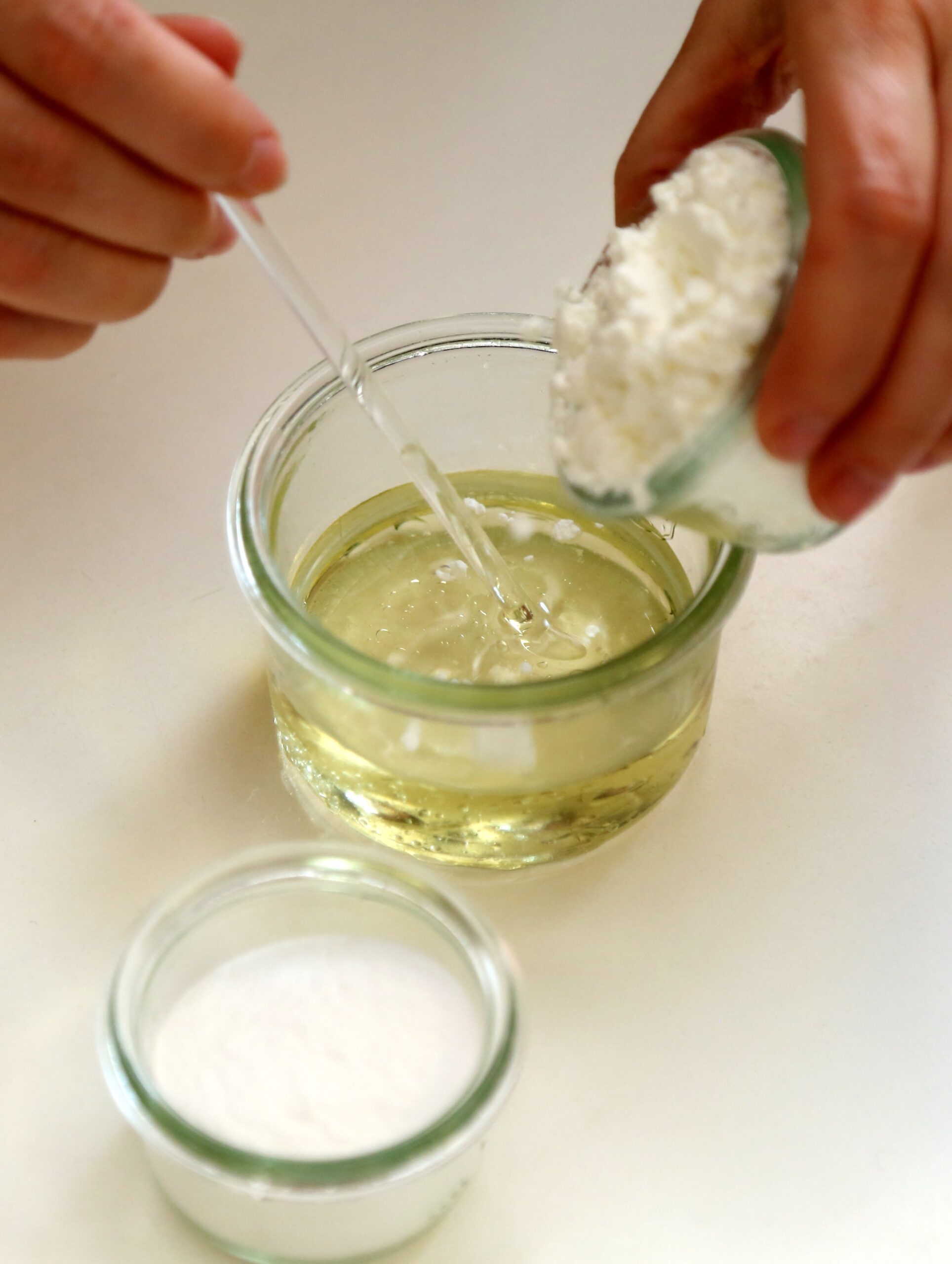 25 g Kokosöl, 2 g Bienenwachs, je 20 g Natron und Speisestärke