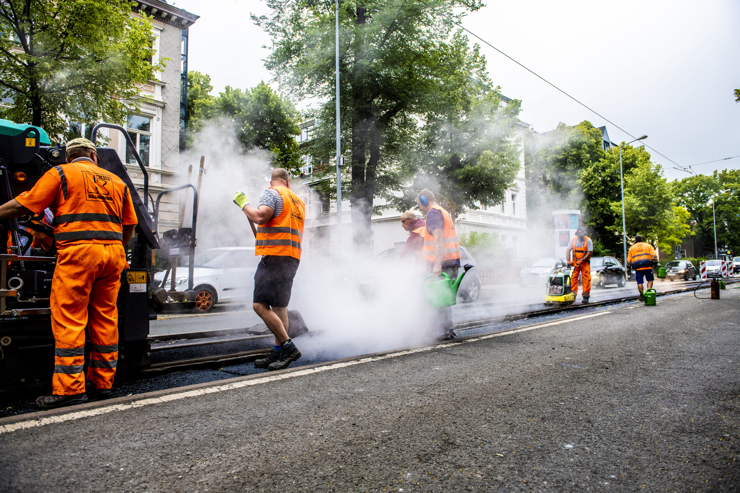 Michael Nitschke ist Betriebsleiter des Unternehmens und er weiß genau, was da vor sich geht: „Wir erneuern vom 20. Juni bis zum 27. Juli die Straßenoberflächen zwischen und neben den Schienen.“ Hier rollt normalerweise die Stadtbahnlinie 6 entlang, zurzeit allerdings ist es der „Schienenersatzverkehr“ (also Busse), der im Einsatz ist. Nitschke: „Das hängt alles mit der Baumaßnahme Marktstraße zusammen, und da bot es sich an die Oberfläche, die in den vergangenen Jahren arg gelitten hatte, zu erneuern.“