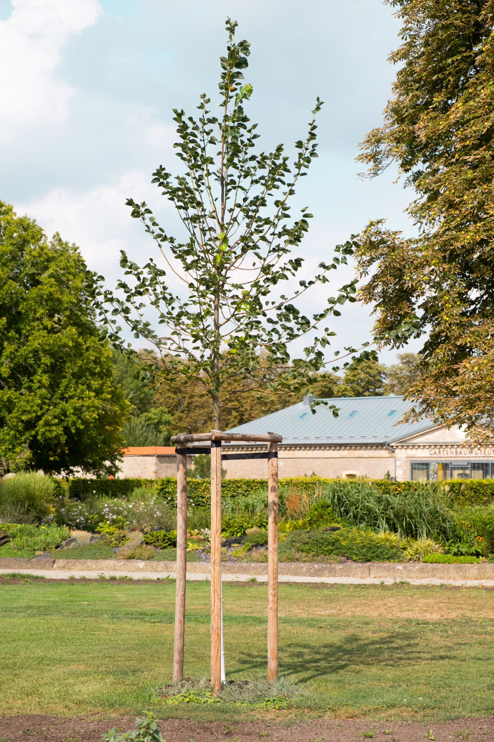 „Nicht nur Blumen, Gemüse und Beete müssen regelmäßig mit Wasser versorgt werden, sondern natürlich auch die Bäume“, betont er. Gegen die Trockenheit in den Böden ist regelmäßiges Gießen am effektivsten. Dabei gibt es Unterschiede zwischen jungen und älteren Bäumen. Während letztere ein tiefes Wurzelwerk haben, das weit in den Boden reicht und somit mehr Grundwasser aufnehmen kann, haben junge Bäume eher Probleme mit der Wasserversorgung. „Hier ist regelmäßiges Gießen in großen Mengen besonders wichtig“, weiß der Gärtnermeister. Man spricht vom sogenannten Trockenstress, wenn Pflanzen unter akutem Wassermangel leiden. Diesen gilt es stets zu vermeiden. Anderenfalls kann die normale Lebens- und Wachstumsfunktion der Bäume stark beeinträchtigt werden, sodass sie frühzeitig Blätter und Früchte verlieren. Wie lange ein Baum als „jung“ klassifiziert wird, hängt von der Baumart ab. Ungefähr 5- bis 7-jährige Bäume gelten als jung und sind auf eine intensivere Bewässerung angewiesen, als reifere Bäume.