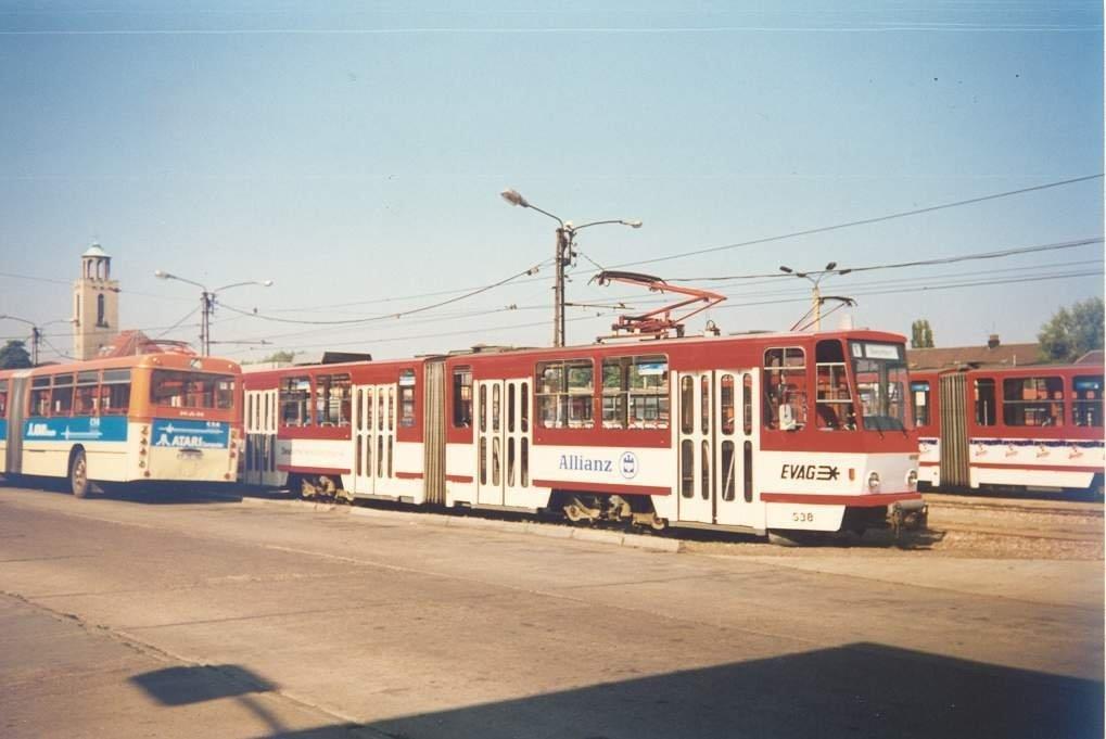 Wer anders als Michael Nitschke kann zu einem alten Foto ganze Geschichten erzählen? Hier gibt uns der Betriebsleiter der EVAG einen Einblick in die Zeit und Fahrzeuge der Verkehrsbetriebe um 1990, die durch Erfurt fuhren. Wie immer verblüfft er mit erstaunlichem Detailwissen.Ein Zeitsprung in das Jahr 1991: Auf dem Betriebshof Magdeburger Allee stehen 2 Tatra-Wagen des letzten nach Erfurt gelieferten Fahrzeugloses. Die 1990 gelieferten Wagen 536 bis 555 waren 1988 bestellt oder besser zugeteilt worden, als der Untergang der DDR noch unvorstellbar erschien. Eigentlich sollten die Wagen schon 1989 geliefert werden, denn in Erfurt herrschte, wie in anderen DDR-Straßenbahnbetrieben auch, eklatanter Fahrzeugmangel. Lieferverzögerungen waren aber zu der Zeit nicht ungewöhnlich und hatten verschiedene Ursachen, die Volkswirtschaft unseres Nachbarlandes lief etwas anders als die der DDR, aber sicher nicht besser. Noch Anfang 1990 liefen in Prag Verhandlungen, die Fahrzeuglieferungen zu stornieren, denn zu der Zeit waren rasante Veränderungen im Nutzungsverhalten der öffentlichen Verkehrsmittel unübersehbar. Davon abgesehen erschien zeitgemäßere Fahrzeugtechnik erreichbar, und sei es nur stromsparende Choppertechnik, mit der Tatra-Wagen bislang aber nur nach Berlin geliefert worden waren.