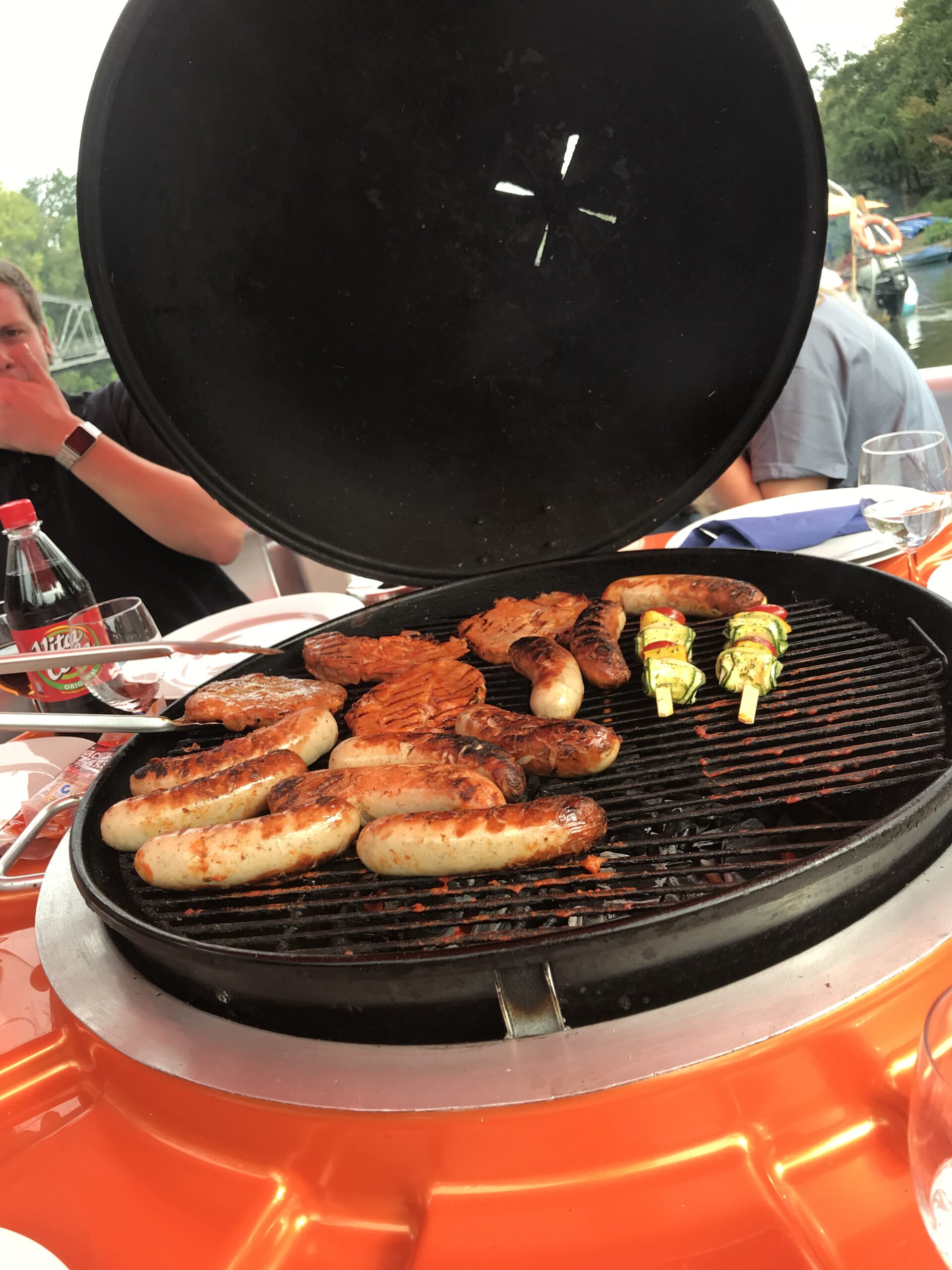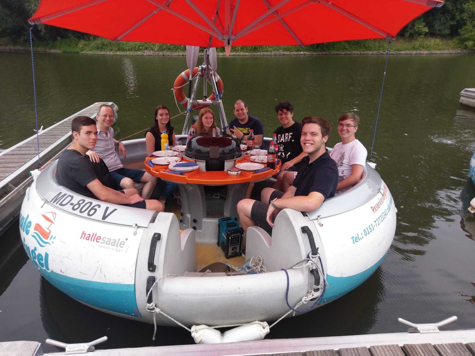 Zur After Hour holten wir uns etwas zu trinken und entspannten uns auf der Terrasse der Jugendherberge. Am Samstagmorgen stand an oberster Stelle, Grillgut zu beschaffen. Denn an diesem Tag war unsere Fahrt mit dem Saale-Kringel geplant. Wer nicht weiß, wovon ich rede, kann es sich so vorstellen: ein Schlauchboot in Donut-Form mit einem großen Grill in der Mitte und einem Sonnenschirm.