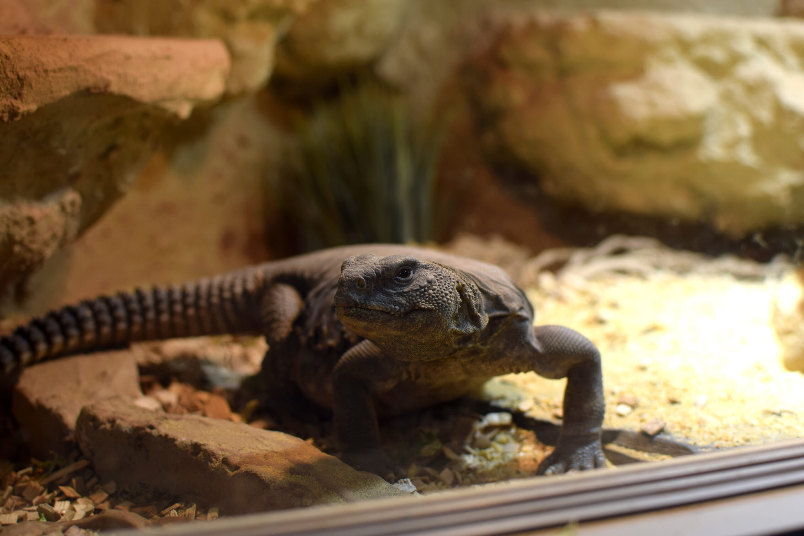 Dicker liegt auf seinem Höhlentempel und lässt sich von der Sonne bestrahlen. Kreativ genug, unserer Echse einen Namen zu geben, waren wir nicht. Also heißt er einfach „Dicker“. Dicker, etwa 7 Jahre alt, ist eine ägyptische Dornschwanzagame und lebt in einem großen Terrarium. Seine Lieblingsbeschäftigung: rumliegen. Den ganzen Tag. Außer wenn es Futter gibt. Dann bewegt er sich zum Napf, frisst eher hastig als genüsslich und chillt danach weiter. Mit Linsen und Grünzeugs füttert man ihn glücklich. Als gustatorische Besonderheit gibt es ab und an Grillen oder Basilikumblätter.