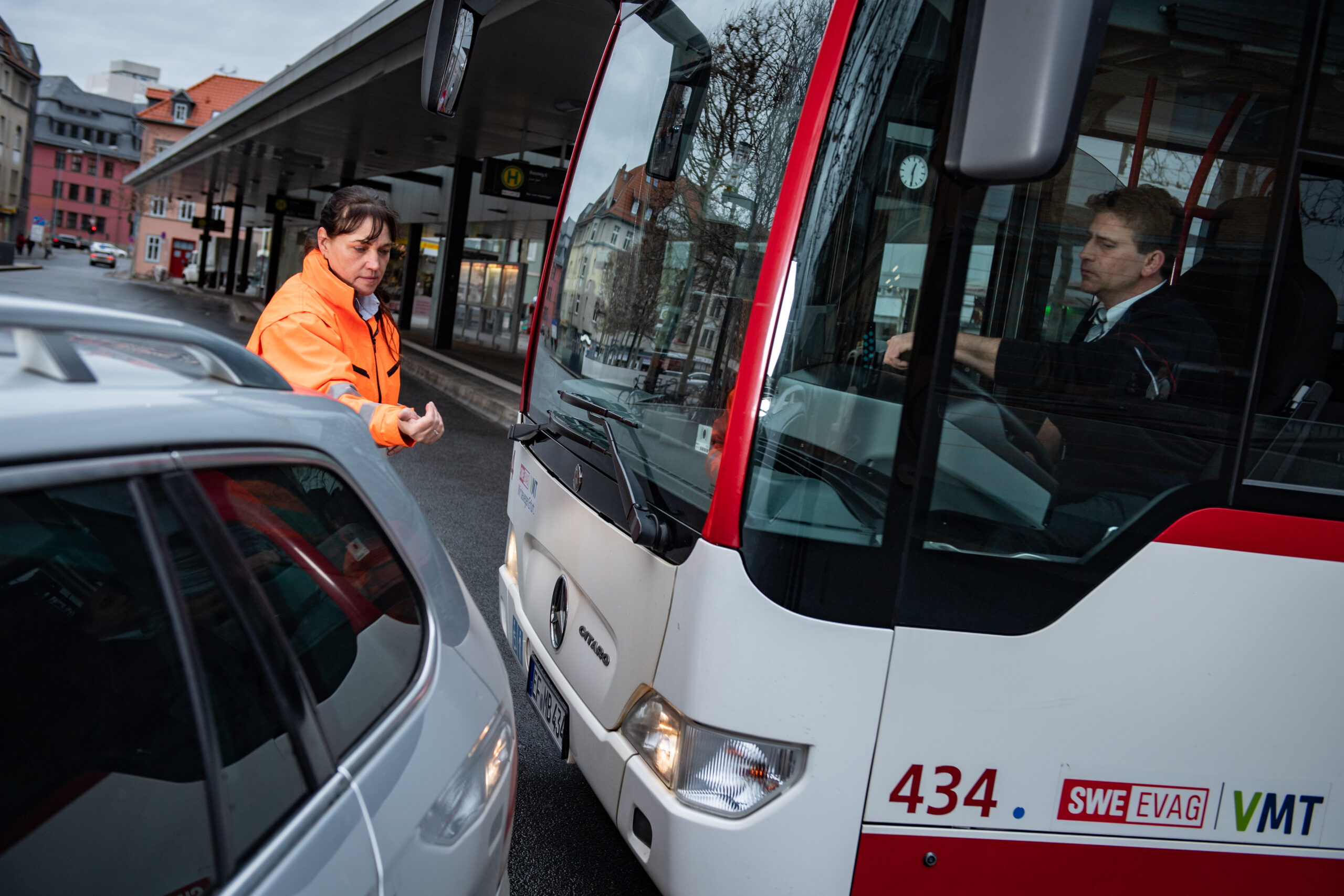 Auch rund um Hochheim ist es schwierig, hier werden die Busse regelmäßig behindert. Und auch direkt am Busbahnhof wird falsch geparkt. „Teilweise stehen die Pkw an der Einfahrt zu den Bussteigen, sodass kein Bus mehr durchkommt. Es kann so nicht weitergehen, schließlich müssen wir an unsere Fahrgäste denken. Die Dispatcher der EVAG machen vor Ort Fotos von den Falschparkern und erfassen die Daten auf einem Vordruck. Egal, ob das Falschparken im Haltestellenbereich vorkommt oder an anderen Stellen für Behinderungen des ÖPNV sorgt, es wird konsequent verfolgt, um den notwendigen Ordnungszustand wieder herzustellen. Bei schwerwiegenden Parkverstößen, z. B. beim Parken im Fahrraum von Straßenbahnen oder beim Zuparken von Haltestellen nützt uns auch kein Knöllchen mehr. Wenn die Fahrgäste nicht aussteigen können, weil ein Pkw an der Haltestelle parkt, bleibt oft nur der Abschleppdienst“, sagt Enrico Raab.