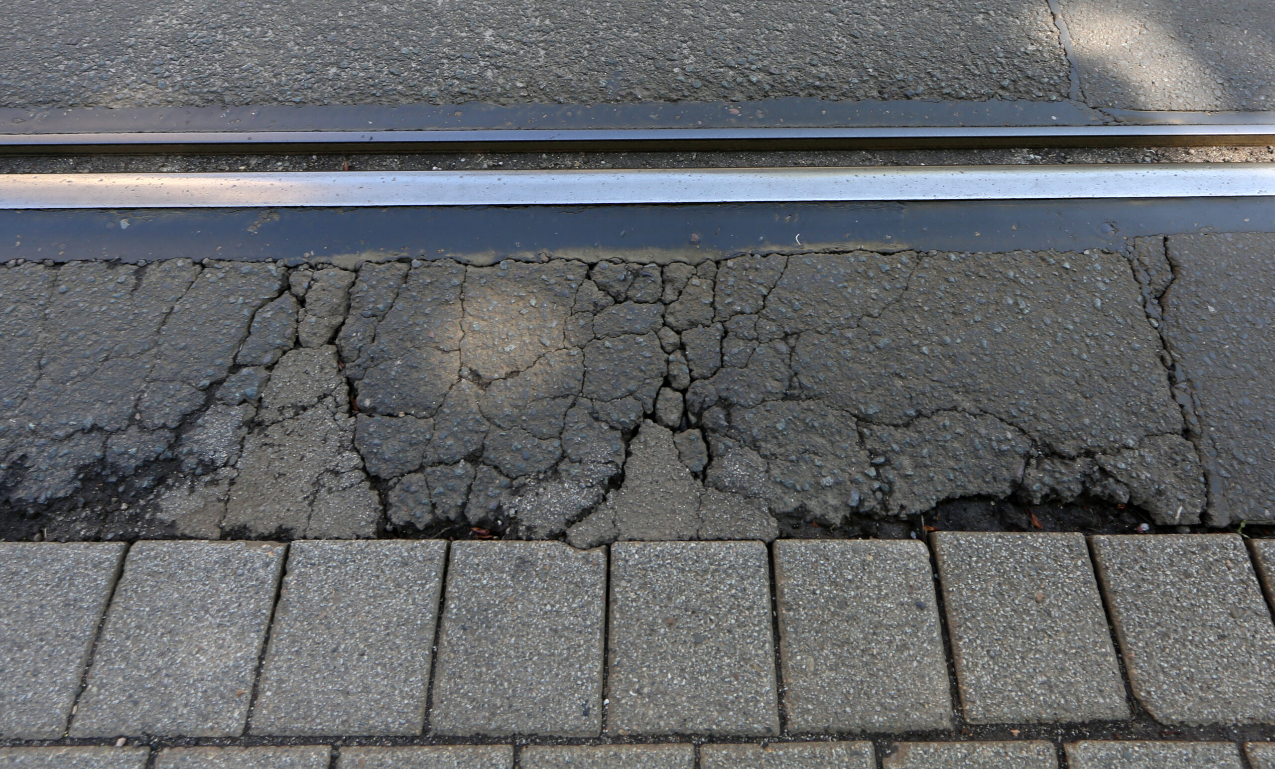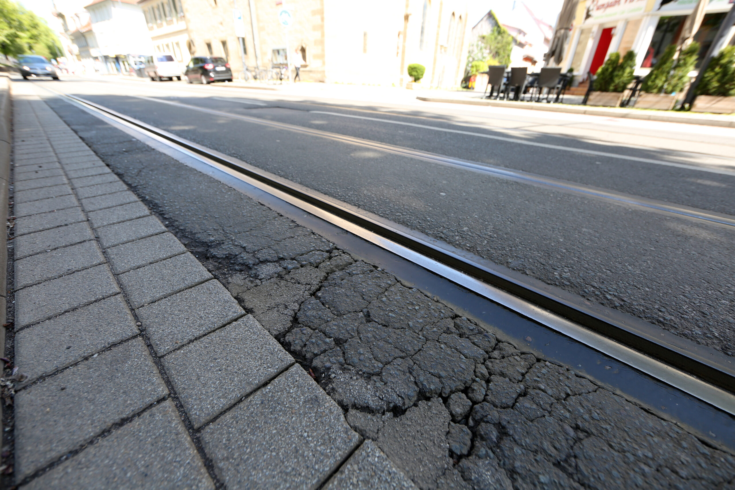 Wer genau hinschaut, sieht auch in Höhe Webergasse, dass die Straße Schlaglöcher in unmittelbarer Nähe zu den Gleisen hat. Die Gleistragschicht musste dort dringend erneuert werden.